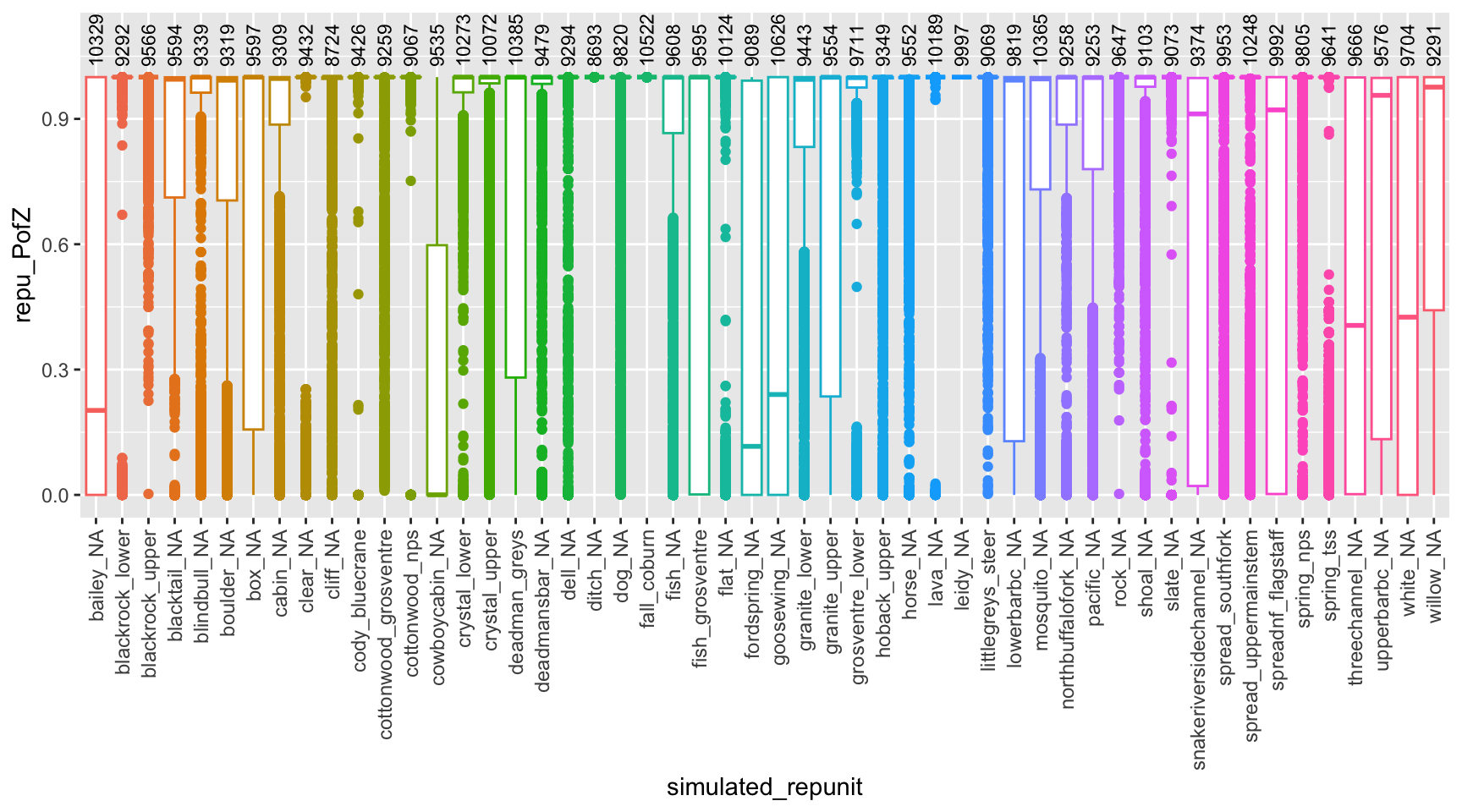 # first summarize by reporting unitrepu_pofzs<-usr_sims$indiv_posteriors%>%filter(repunit==simulated_repunit)%>%group_by(iter, indiv, simulated_repunit, repunit)%>%# first aggregate over reporting unitssummarise(repu_PofZ =sum(PofZ))%>%ungroup()%>%arrange(repunit, simulated_repunit)%>%mutate(simulated_repunit =factor(simulated_repunit, levels =unique(simulated_repunit)))# also get the number of simulated individuals from each collectionnum_simmed<-usr_sims$indiv_posteriors%>%group_by(iter, indiv)%>%slice(1)%>%ungroup()%>%count(simulated_repunit)# now, plot itggplot(repu_pofzs, aes(x =simulated_repunit, y =repu_PofZ))+geom_boxplot(aes(colour =repunit))+geom_text(data =num_simmed, mapping =aes(y =1.025, label =n), angle =90, hjust =0, vjust =0.5, size =3)+theme(axis.text.x =element_text(angle =90, hjust =1, size =9, vjust =0.5))+ylim(c(NA, 1.1))+guides(colour =FALSE)