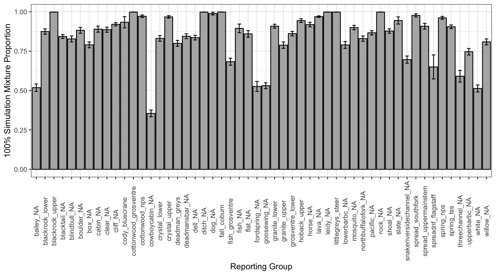 As noted elsewhere, 100% simulations are used less frequently than in the past as assumptions are unrealistic (i.e., assume mixtures only made up of individuals from a single reporting group). However, we perform them here as they provide another diagnostic tool to assess the performance of our baseline.