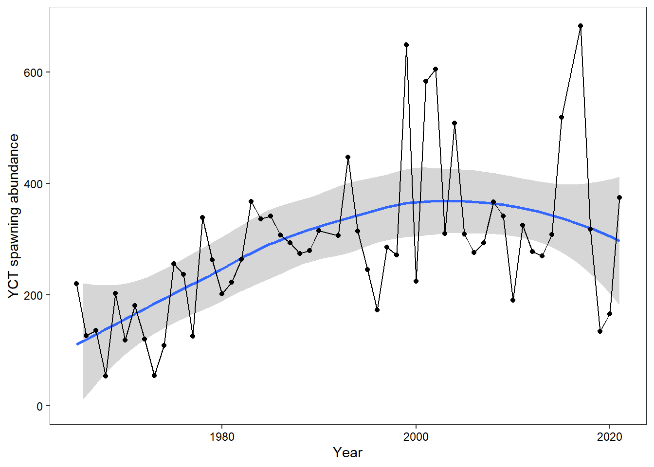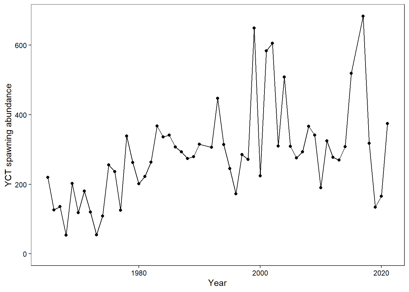 Plot time series of YCT spawning abundance in Lower Bar BC (enumerated at the WGFD weir). Abundance data are corrected for interannual variation in monitoring period using a run timing model as in Baldock et al. (2023, CJFAS).