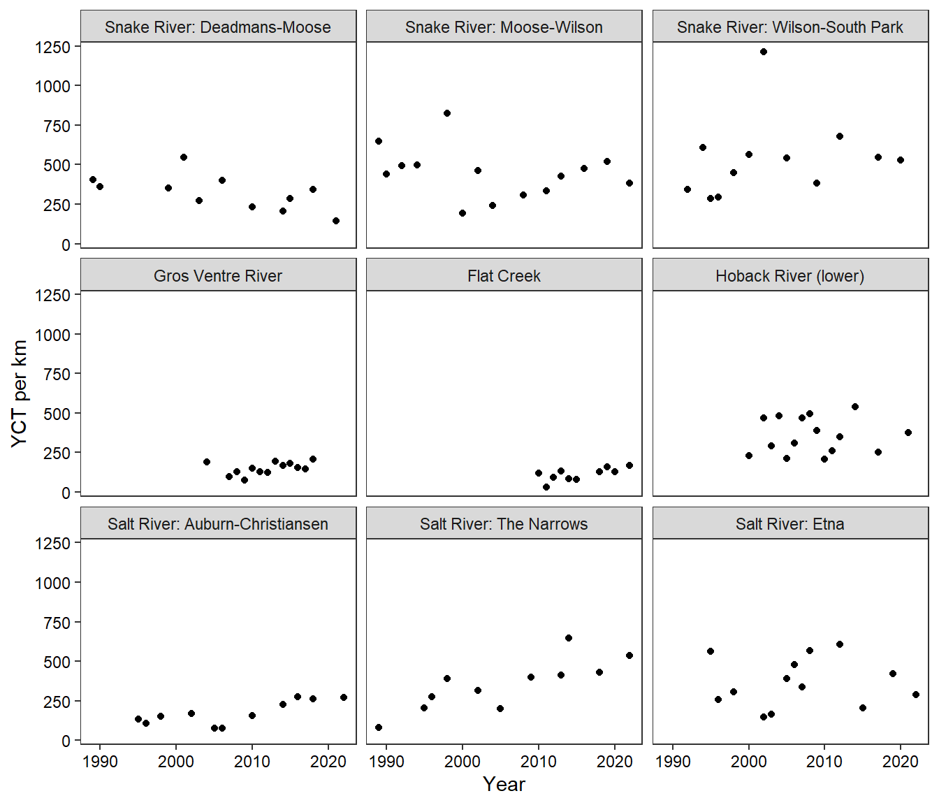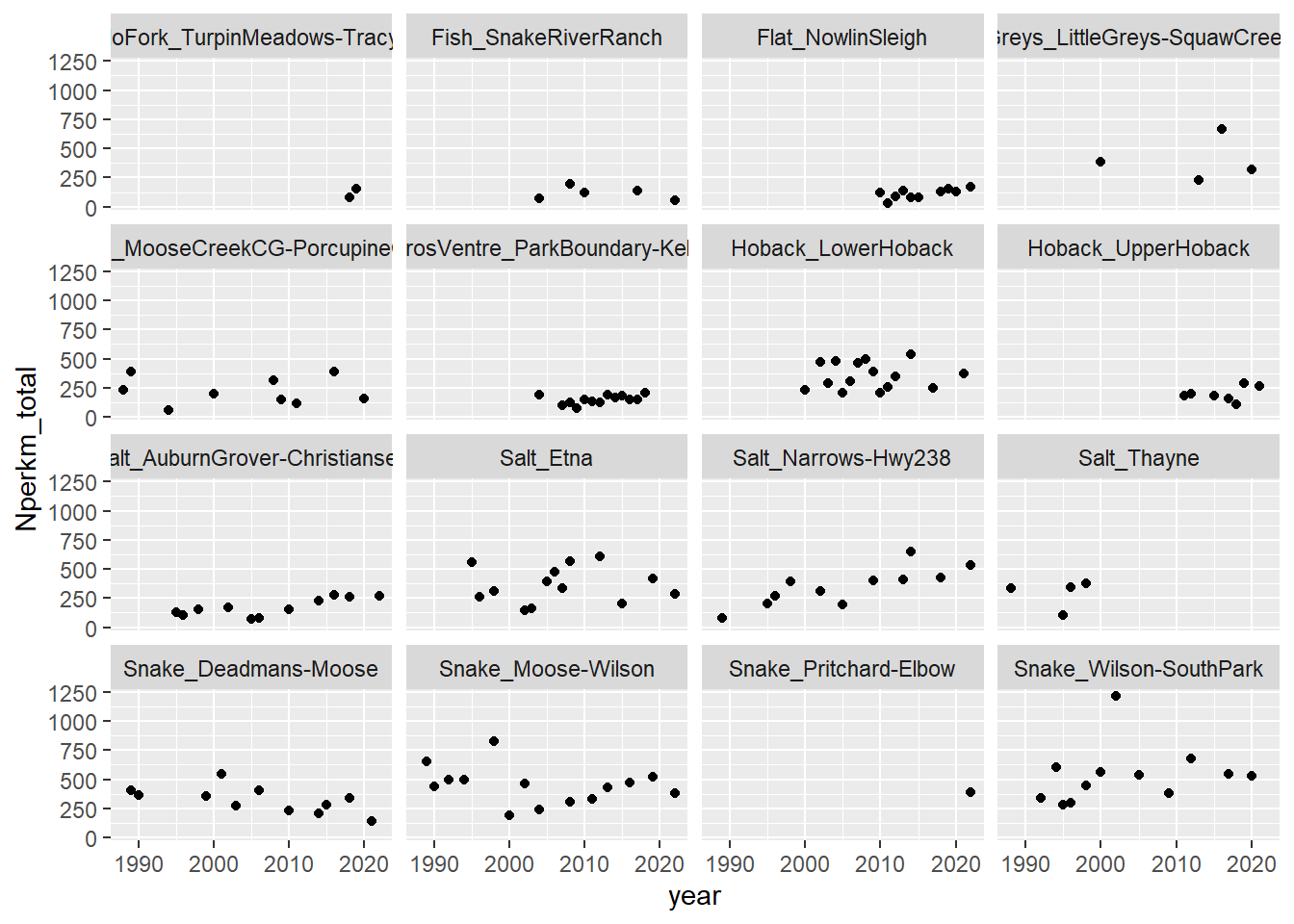 reddcts %>%filter(stream !="Cody") %>%mutate(stream =recode(stream, "3 Channel"="Three Channel", "Snake River Side Channel"="SR Side Channel")) %>%mutate(stream =factor(stream, levels =c("Cowboy Cabin", "Upper Bar BC", "SR Side Channel", "Blacktail","Three Channel", "Price", "Lower Bar BC", "Little Bar BC", "Fish", "Flat", "Nowlin", "Spring", "Blue Crane", "Dave", "Laker", "Christiansen"))) %>%ggplot(aes(x = year, y = reddsperkm)) +#geom_smooth() +geom_point() +facet_wrap(~stream) +xlab("Year") +ylab("Redds per km") +#ylim(0,900) +theme_bw() +theme(panel.grid =element_blank(), axis.text =element_text(color ="black"))