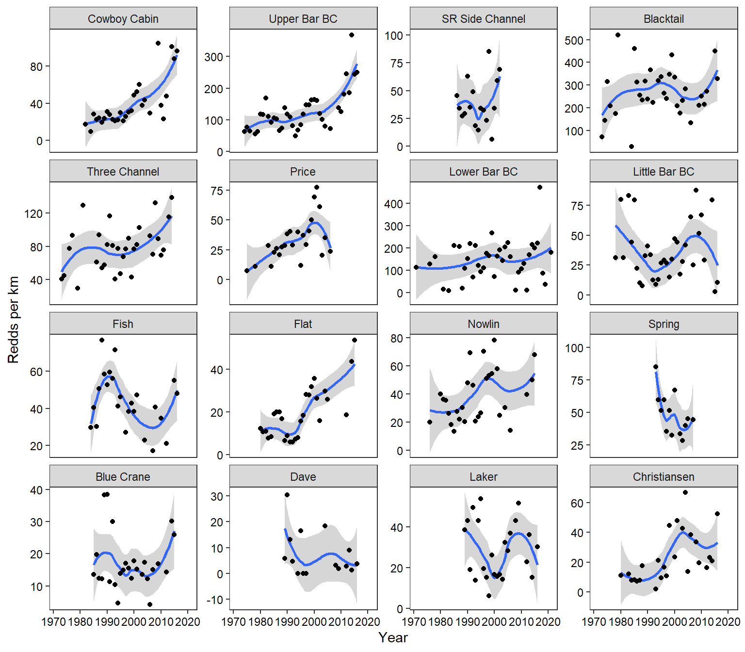 reddcts %>%filter(stream !="Cody") %>%mutate(stream =recode(stream, "3 Channel"="Three Channel", "Snake River Side Channel"="SR Side Channel")) %>%mutate(stream =factor(stream, levels =c("Cowboy Cabin", "Upper Bar BC", "SR Side Channel", "Blacktail","Three Channel", "Price", "Lower Bar BC", "Little Bar BC", "Fish", "Flat", "Nowlin", "Spring", "Blue Crane", "Dave", "Laker", "Christiansen"))) %>%ggplot(aes(x = year, y = reddsperkm)) +geom_smooth() +geom_point() +facet_wrap(~stream, scales ="free_y") +xlab("Year") +ylab("Redds per km") +#ylim(0,900) +theme_bw() +theme(panel.grid =element_blank(), axis.text =element_text(color ="black"))