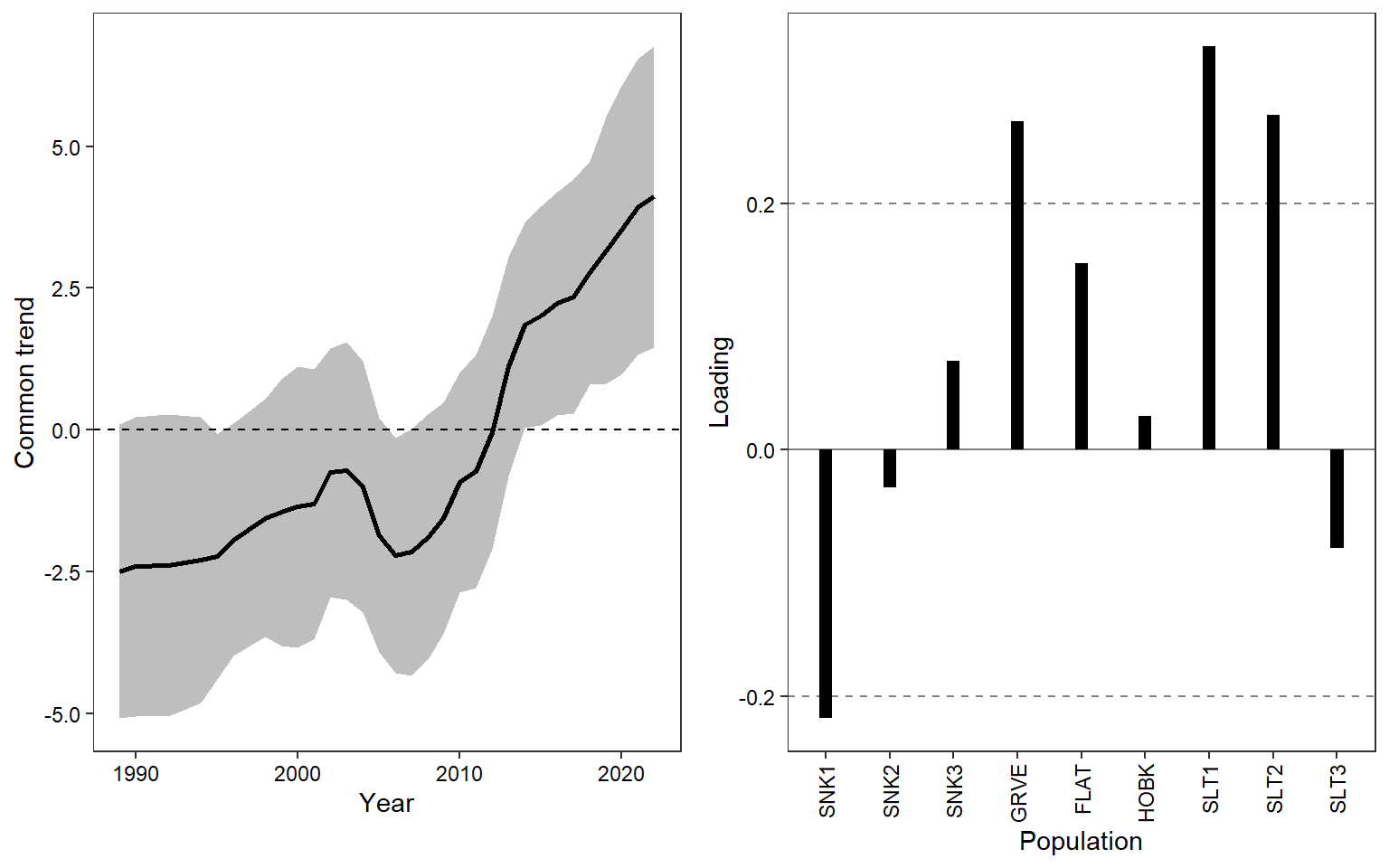 Use dynamic factor analysis, DFA, to extract common trends from the population estimate data and estimate the loading of each population onto each trend (Zuur et al. 2003, Ohlberger et al. 2016).
