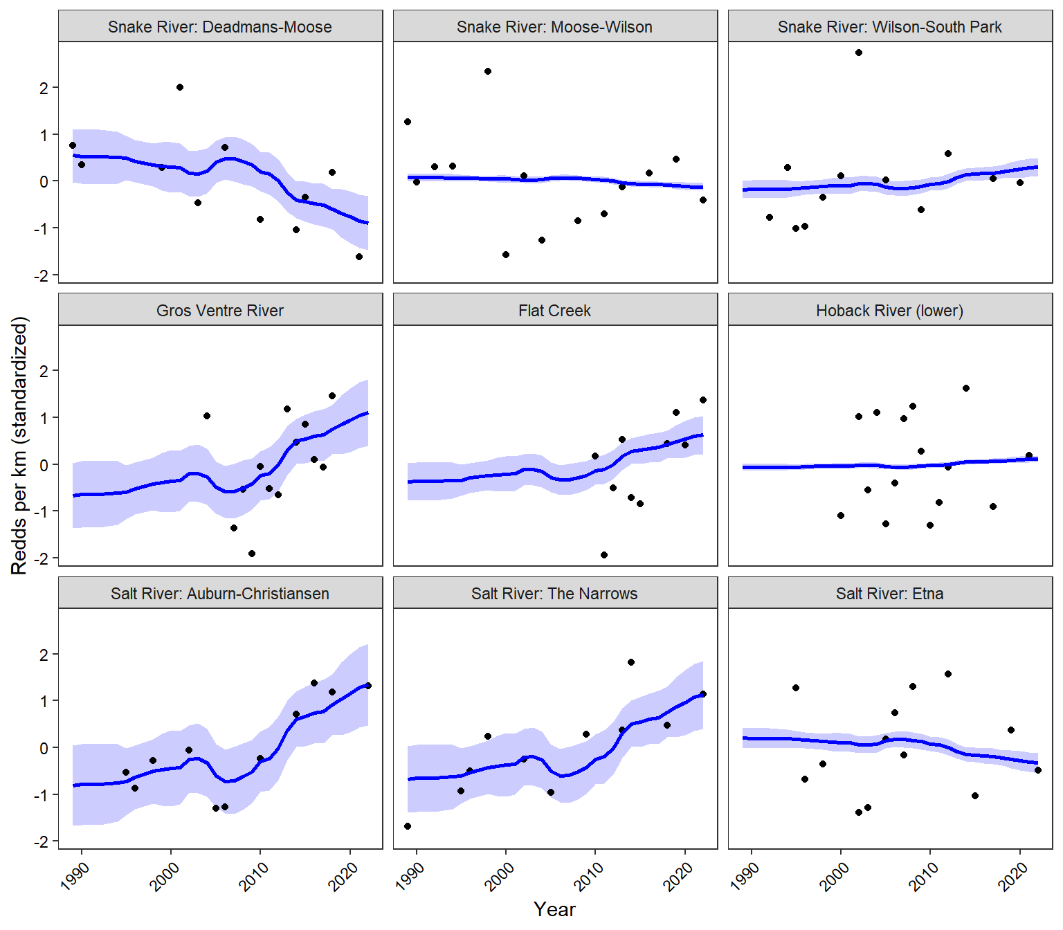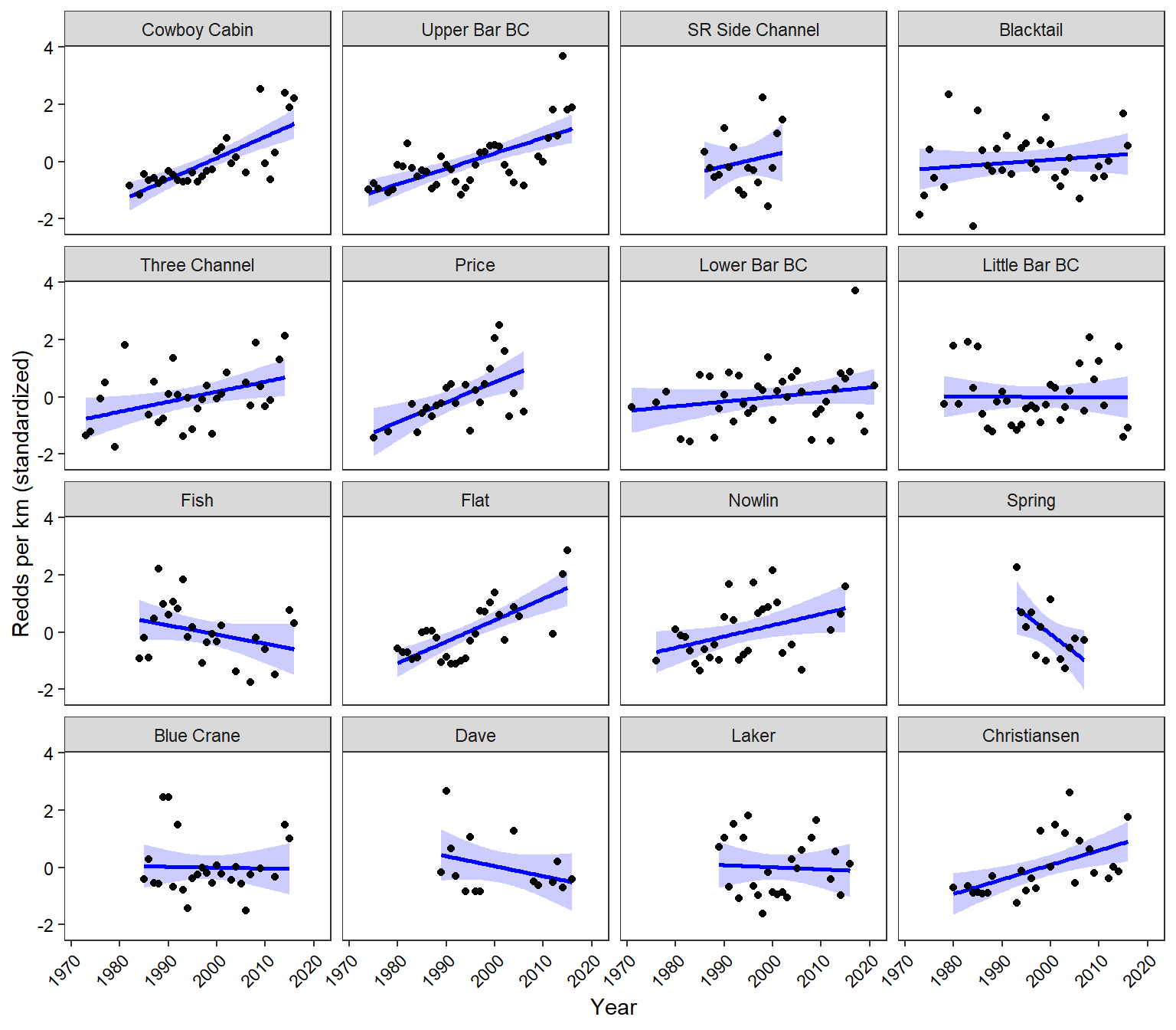 reddcts %>%group_by(stream) %>%mutate(reddsscaled =scale(reddsperkm)) %>%ungroup() %>%ggplot(aes(x = year, y = reddsscaled)) +geom_smooth(method ="lm", se =TRUE, color ="blue", fill ="blue", alpha =0.2) +geom_point() +facet_wrap(~stream) +xlab("Year") +ylab("Redds per km (standardized)") +theme_bw() +theme(panel.grid =element_blank(), axis.text =element_text(color ="black"), axis.text.x =element_text(angle =45, vjust =1, hjust=1))