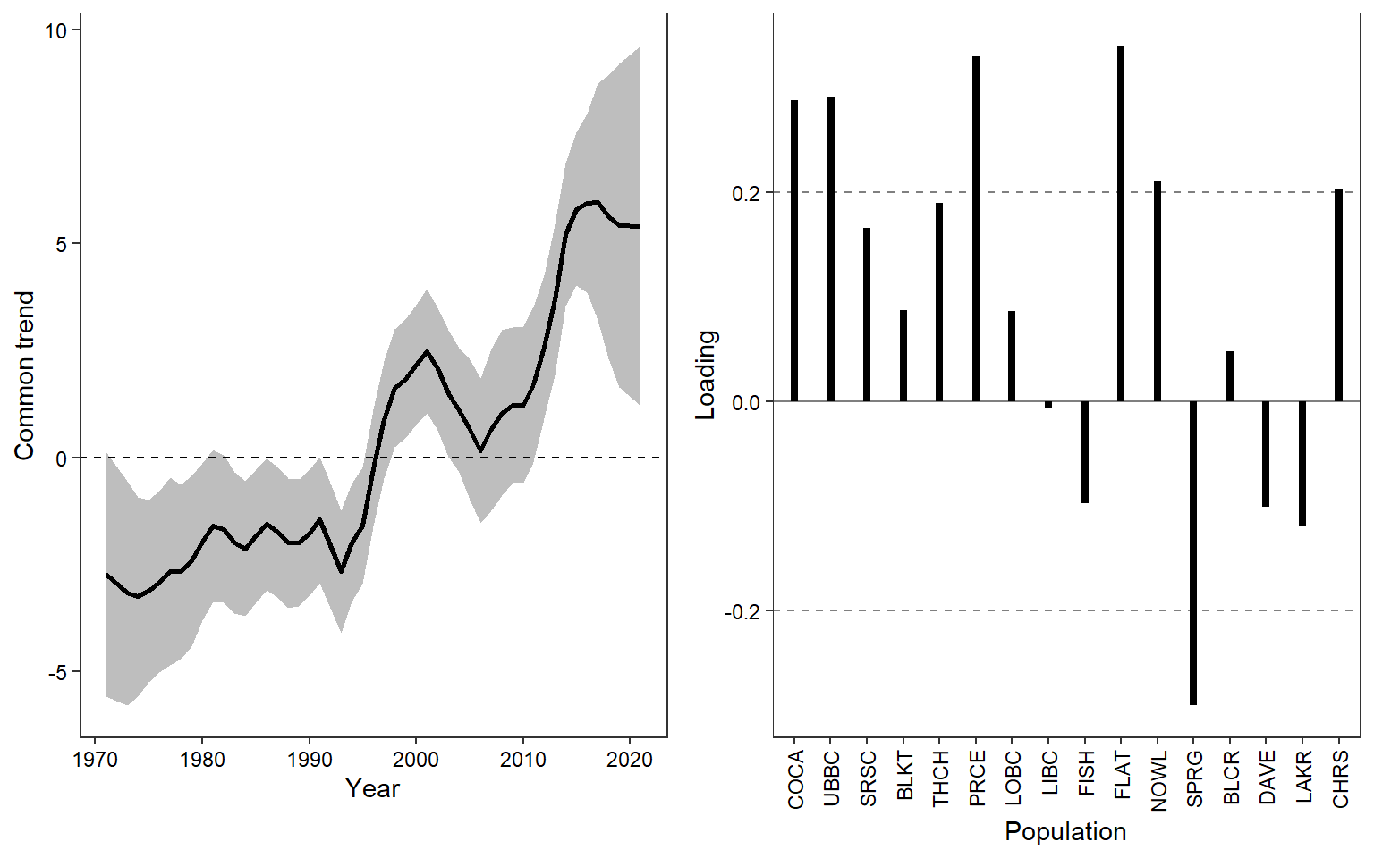 Plot (rotated) common trend and loadings. The common trend indicates a period of relative stability (pre-1993) followed a period of increasing redd densities in spring-fed spawning tributaries (1993-2022). This post-1993 period of population increases is interrupted by a short period (ca. 5 years) of decline in the early 2000s. Most populations load positively onto the common trend, but particularly Cowboy Cabin Spring, Upper Bar BC Spring, Price Spring, Flat Creek, Nowlin Creek, and Christiansen Spring. Spring Creek shows the opposite trend, indicating a decline in redd densities since the 1990s (although note that data for this population is only available from 1993 to 2007). Redd densities in all other populations are generally stable over the period of record.