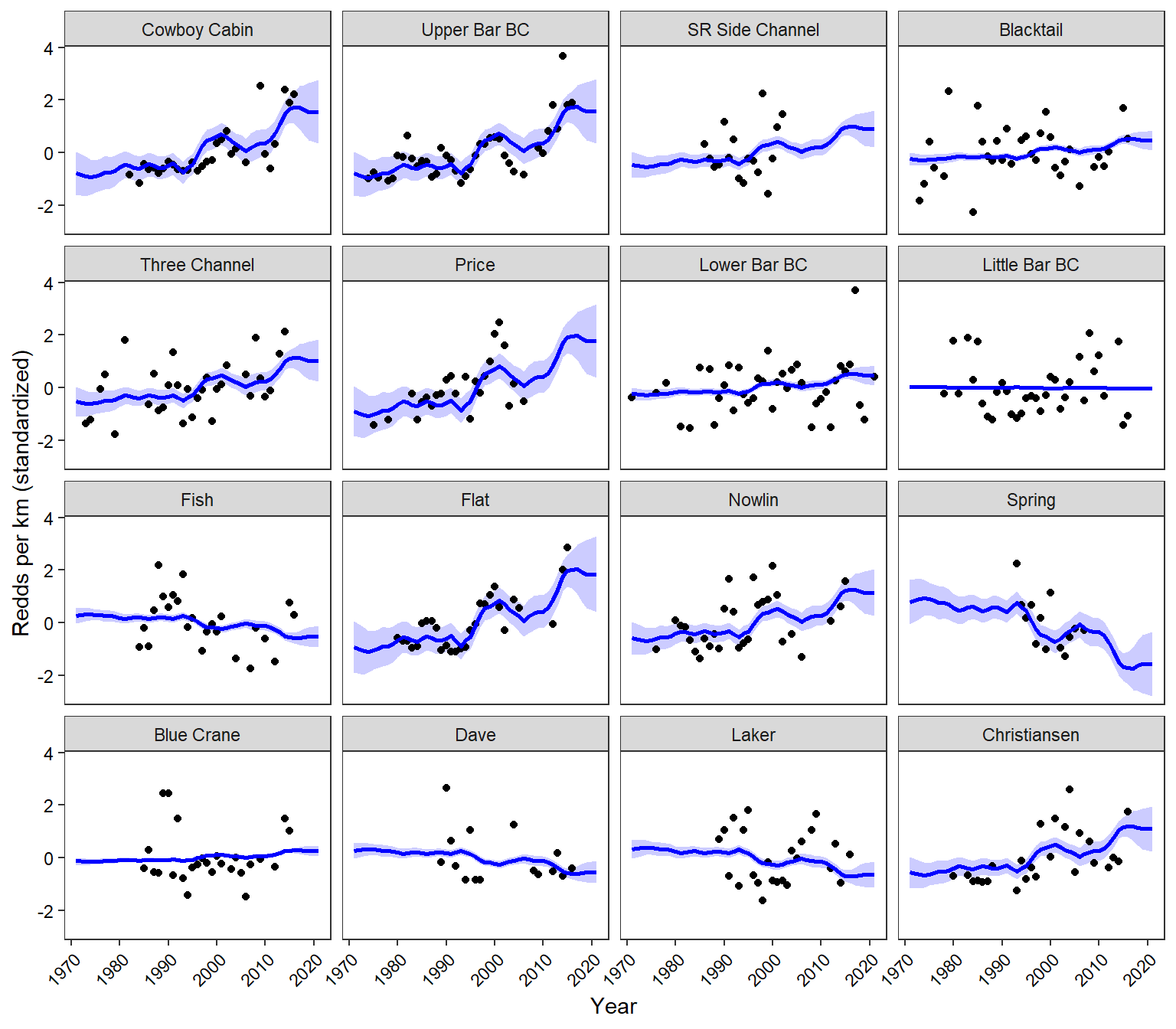 # run kalman filterkf <-MARSSkfss(topmod)# extract model componentsZ_mat <-coef(topmod, type ="matrix")$Z # Loadings (n_series x n_trends)xtT <- kf$xtT # States (n_trends x time)VtT <- kf$VtT # State covariance matrices (n_trends x n_trends x time)# compute fitted values and standard errorsn_series <-nrow(Z_mat)n_time <-ncol(xtT)fitted_vals <- Z_mat %*% xtT # n_series x timese_vals <-matrix(NA, n_series, n_time) # standard errorsfor (t in1:n_time) { Vt <- VtT[, , t] Var_yt <- Z_mat %*% Vt %*%t(Z_mat) se_vals[, t] <-sqrt(diag(Var_yt)) # std dev for each series at time t}# construct 95% confidence intervalsupper_band <- fitted_vals +1.96* se_valslower_band <- fitted_vals -1.96* se_vals# plotas_tibble(t(fitted_vals)) %>%mutate(year = popest_mat$year) %>%gather(key ="stream", value ="fitted", -year) %>%mutate(stream =factor(stream, levels = pops)) %>%left_join(as_tibble(t(upper_band)) %>%mutate(year = popest_mat$year) %>%gather(key ="stream", value ="fitted_up", -year) %>%mutate(stream =factor(stream, levels = pops))) %>%left_join(as_tibble(t(lower_band)) %>%mutate(year = popest_mat$year) %>%gather(key ="stream", value ="fitted_low", -year) %>%mutate(stream =factor(stream, levels = pops))) %>%left_join(as_tibble(t(popest_mat_formatted)) %>%mutate(year = popest_mat$year) %>%gather(key ="stream", value ="observed", -year) %>%mutate(stream =factor(stream, levels = pops))) %>%ggplot() +geom_ribbon(aes(x = year, ymin = fitted_low, ymax = fitted_up), fill ="blue", alpha =0.2) +geom_point(aes(x = year, y = observed)) +geom_line(aes(x = year, y = fitted), color ="blue", size =1) +facet_wrap(~stream) +xlab("Year") +ylab("Redds per km (standardized)") +theme_bw() +theme(panel.grid =element_blank(), axis.text =element_text(color ="black"), axis.text.x =element_text(angle =45, vjust =1, hjust=1))