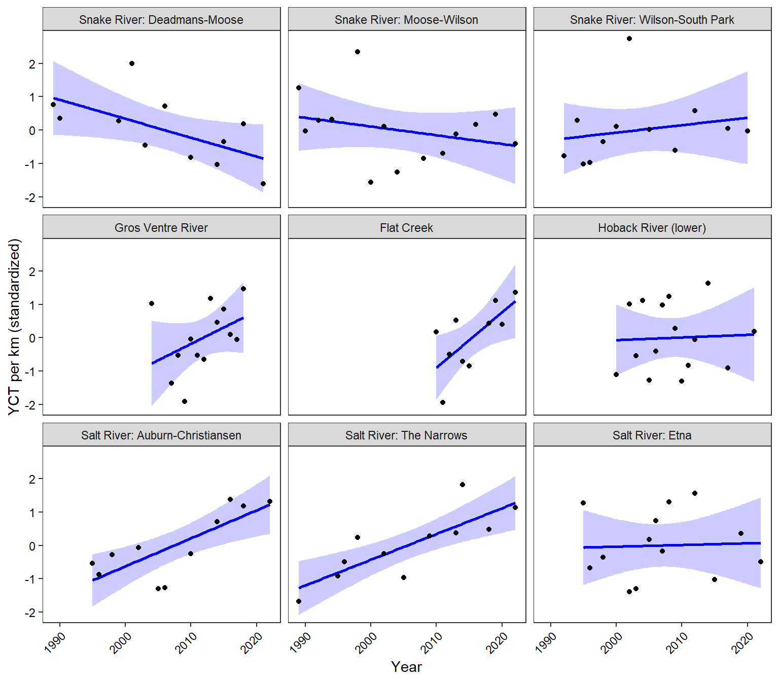 popest %>%group_by(site) %>%mutate(pescaled =scale(Nperkm_total)) %>%ungroup() %>%ggplot(aes(x = year, y = pescaled)) +geom_smooth(method ="lm", se =TRUE, color ="blue", fill ="blue", alpha =0.2) +geom_point() +facet_wrap(~site) +xlab("Year") +ylab("YCT per km (standardized)") +theme_bw() +theme(panel.grid =element_blank(), axis.text =element_text(color ="black"), axis.text.x =element_text(angle =45, vjust =1, hjust=1))