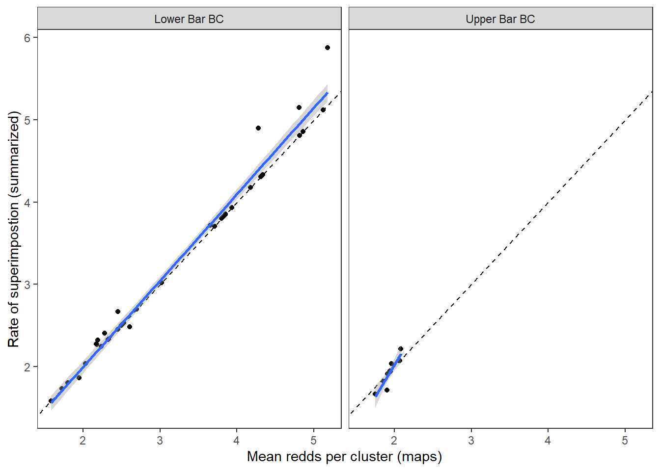 Annual redd count data (avgredds and clusters) are summarized from spawning ground surveys where observers first map redd clusters then estimate the number of redds in each cluster. Annual rates of superimposition can more ~accurately be estimated from these maps by first calculating the rate of superimposition for each cluster, then averaging over all clusters. I previously digitized maps for two streams: Lower Bar BC and Upper Bar BC. Calculate annual superimposition rates (mean and variance) from these data then compare to the “coarse” metrics derived from summarized redd count data. Make sure we see a linear/1:1 relationship