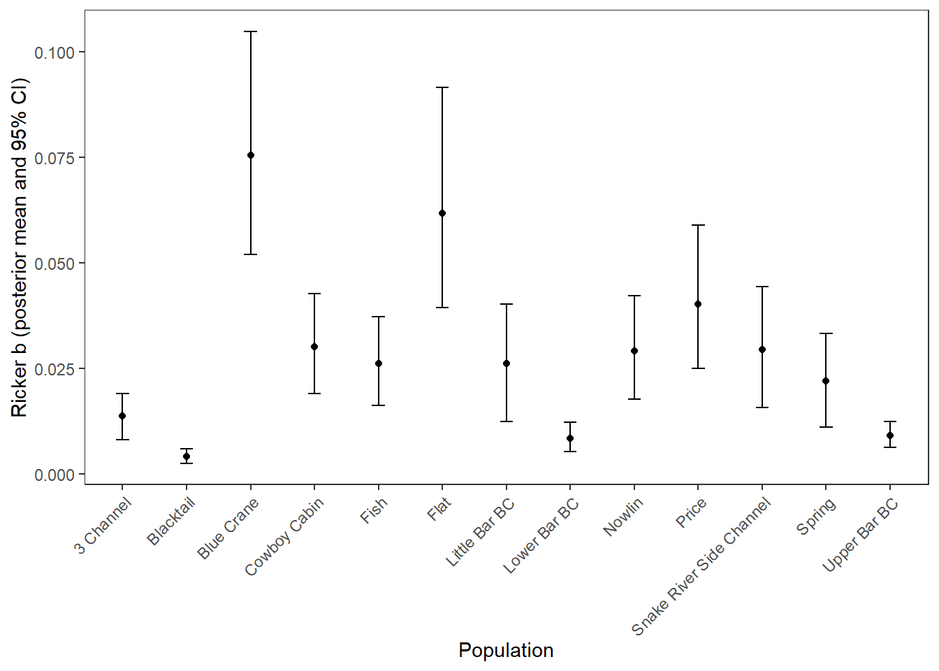 xlab("Population") + ylab("Ricker b (posterior mean and 95% CI)") +