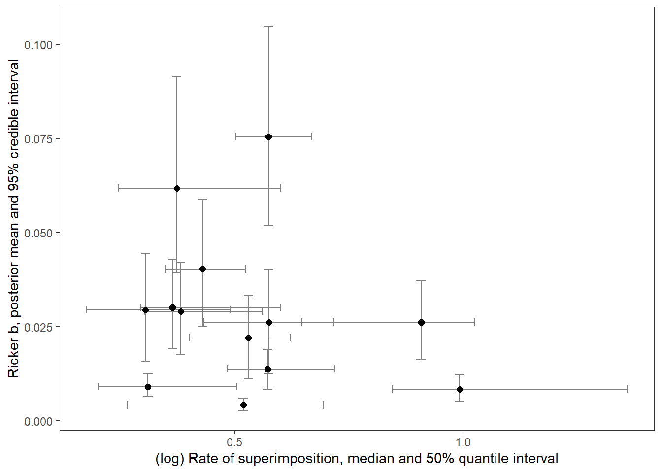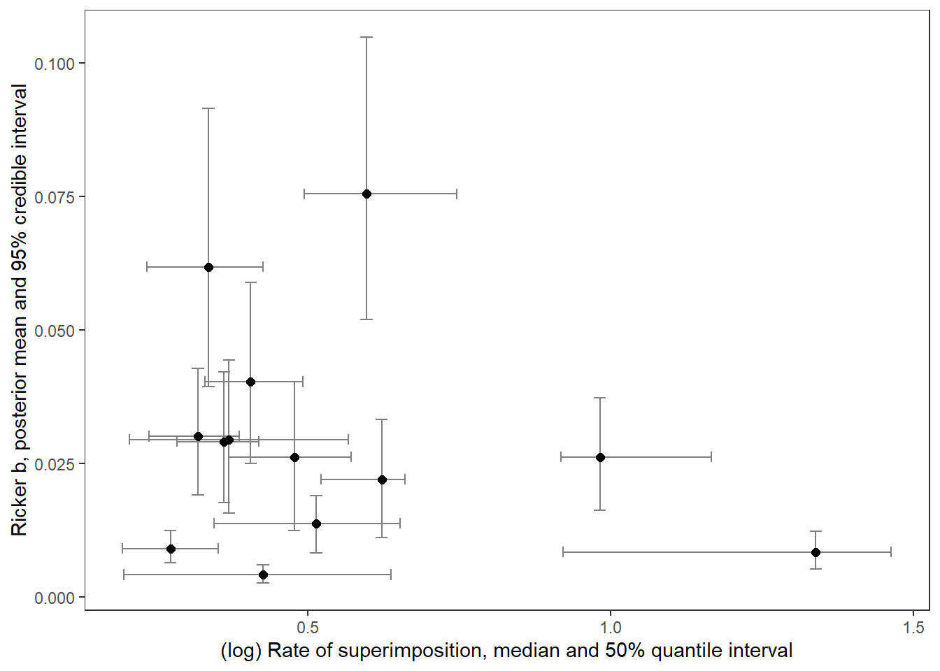 xlab("(log) Rate of superimposition, median and 50% quantile interval") + ylab("Ricker b, posterior mean and 95% credible interval") +