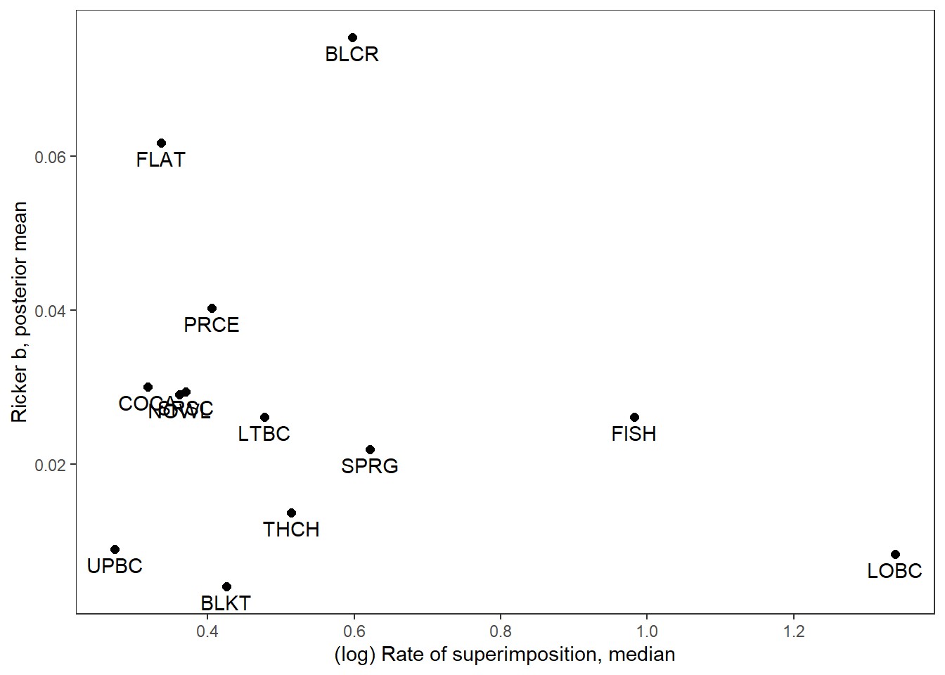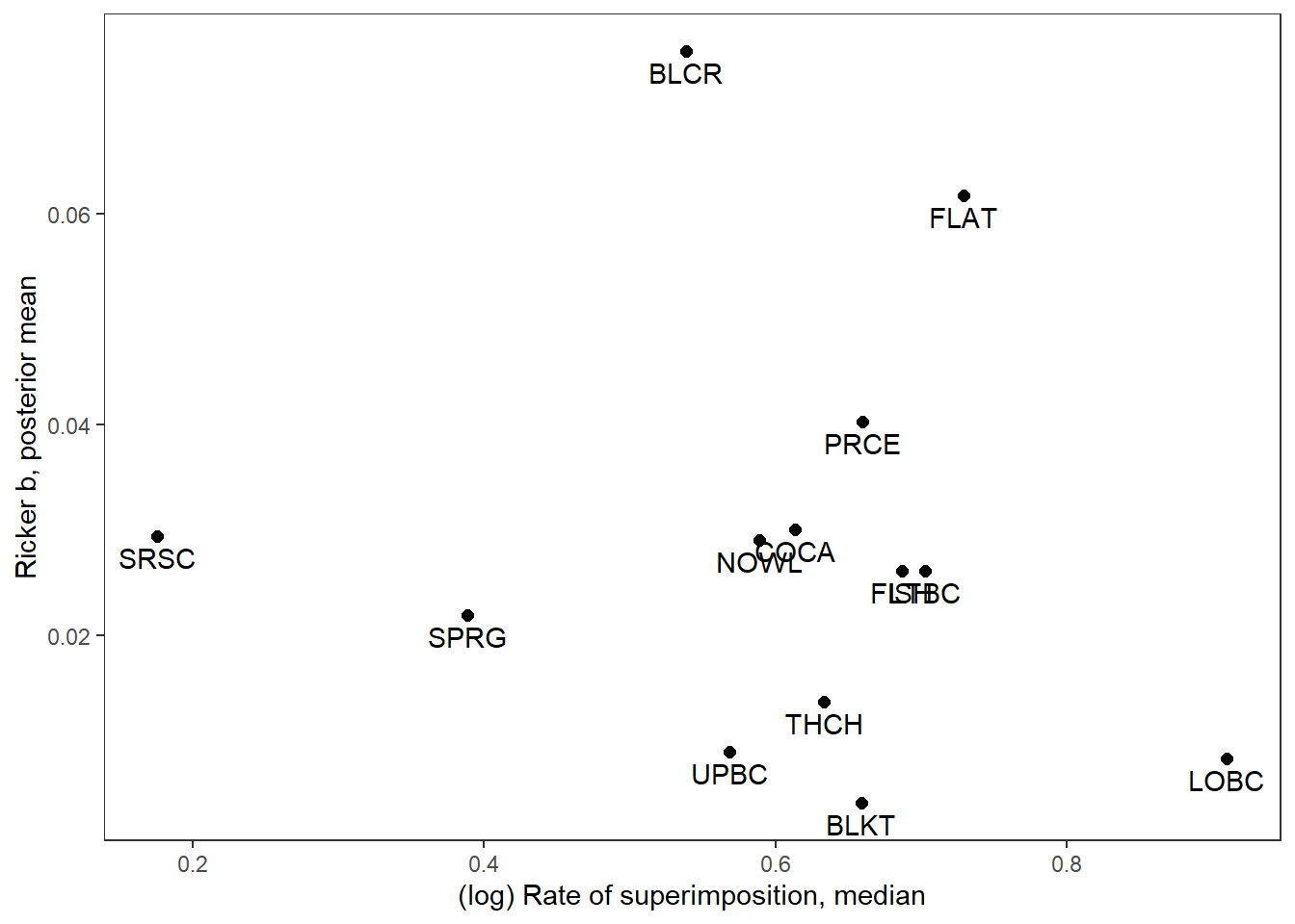 xlab("(log) Rate of superimposition, median") + ylab("Ricker b, posterior mean") +