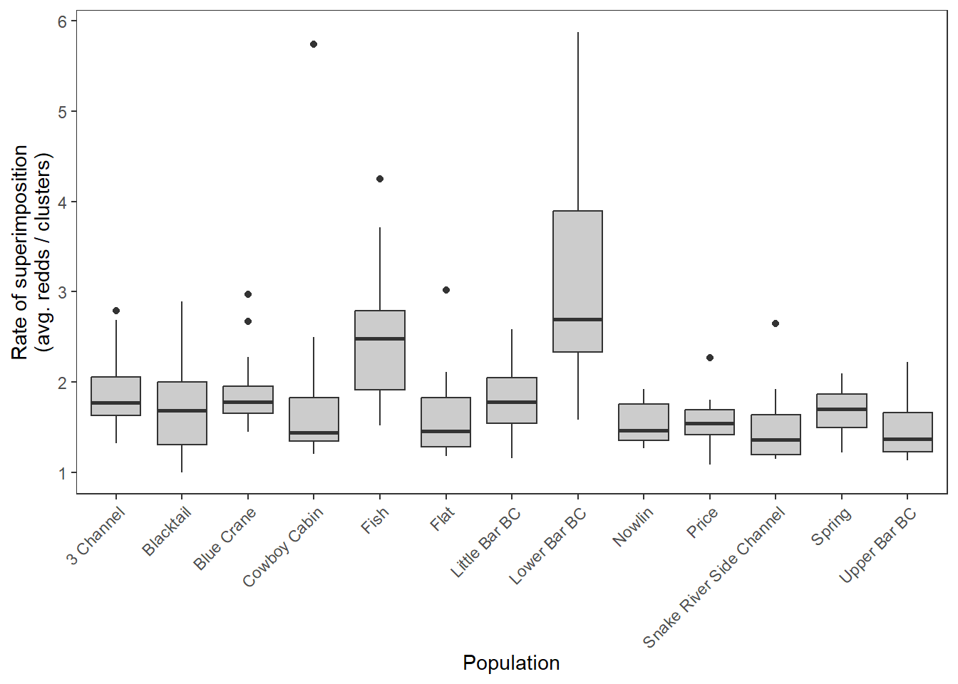 xlab("Population") + ylab("Rate of superimposition\n(avg. redds / clusters)") +