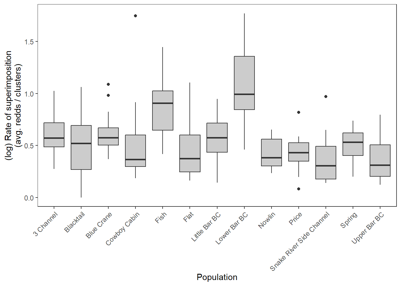 xlab("Population") + ylab("(log) Rate of superimposition\n(avg. redds / clusters)") +