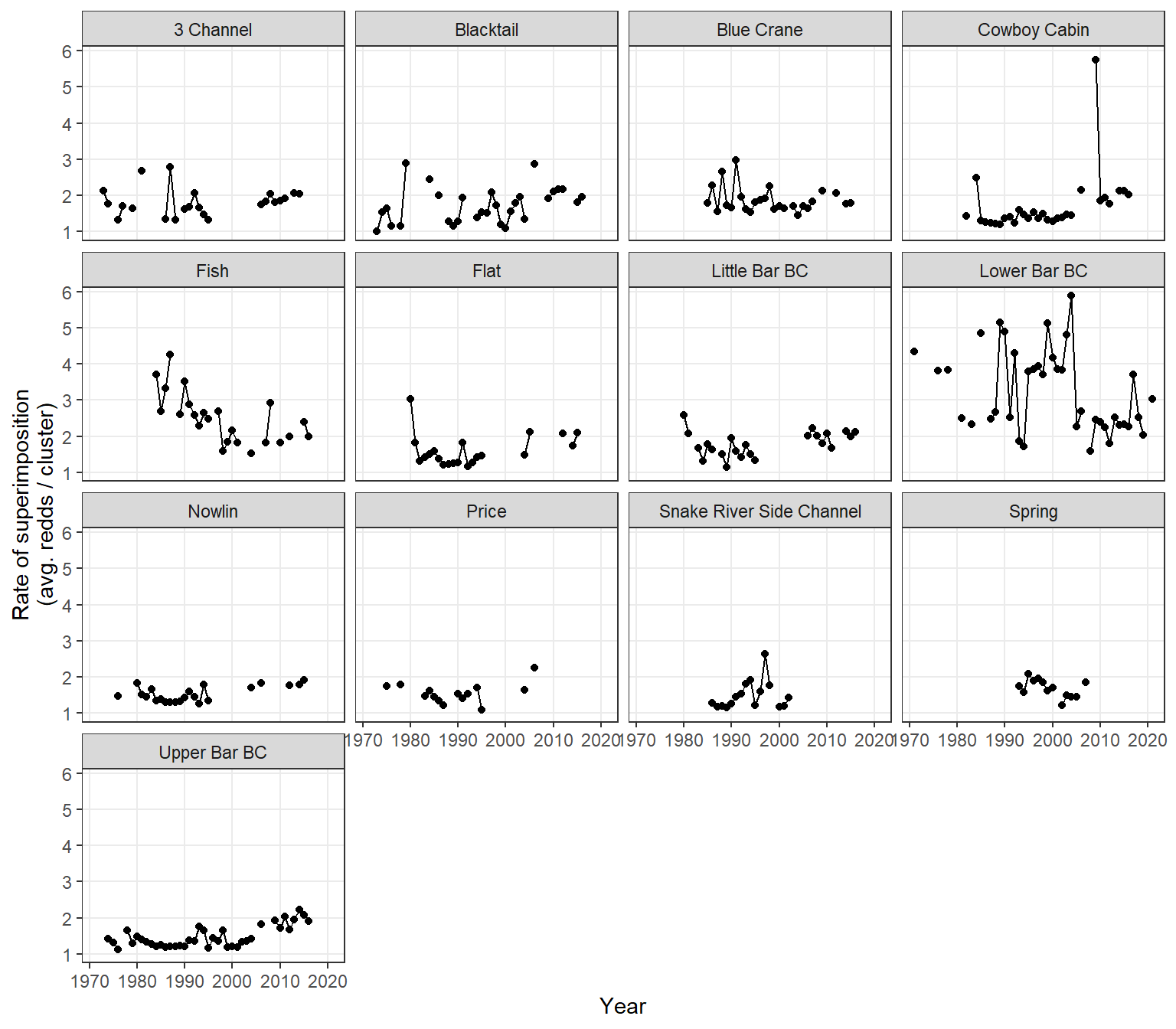 xlab("Year") + ylab("Rate of superimposition\n(avg. redds / cluster)") +