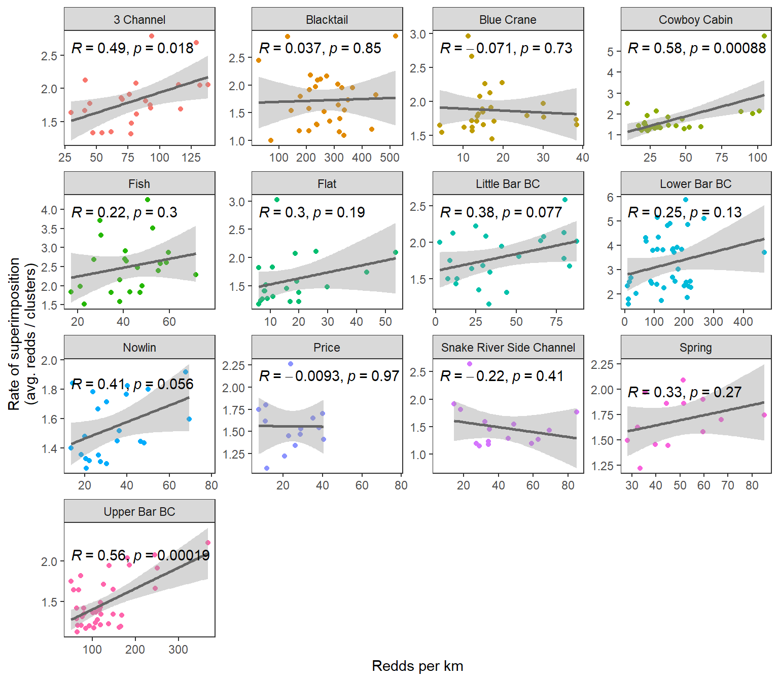 xlab("Redds per km") + ylab("Rate of superimposition\n(avg. redds / clusters)") +