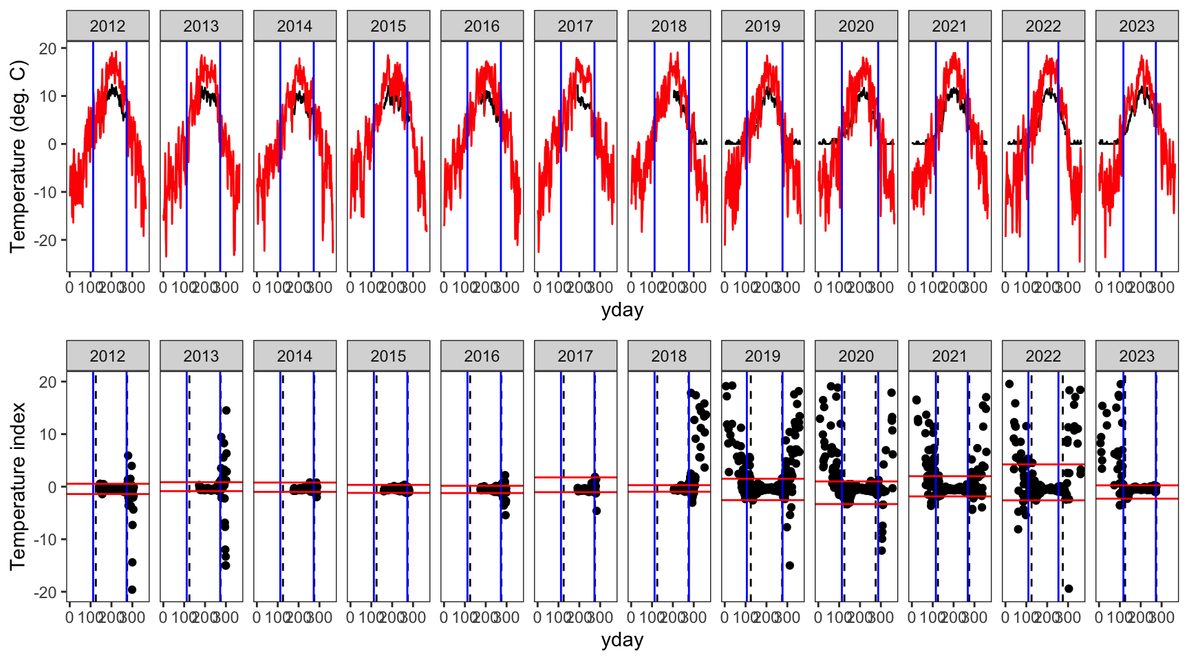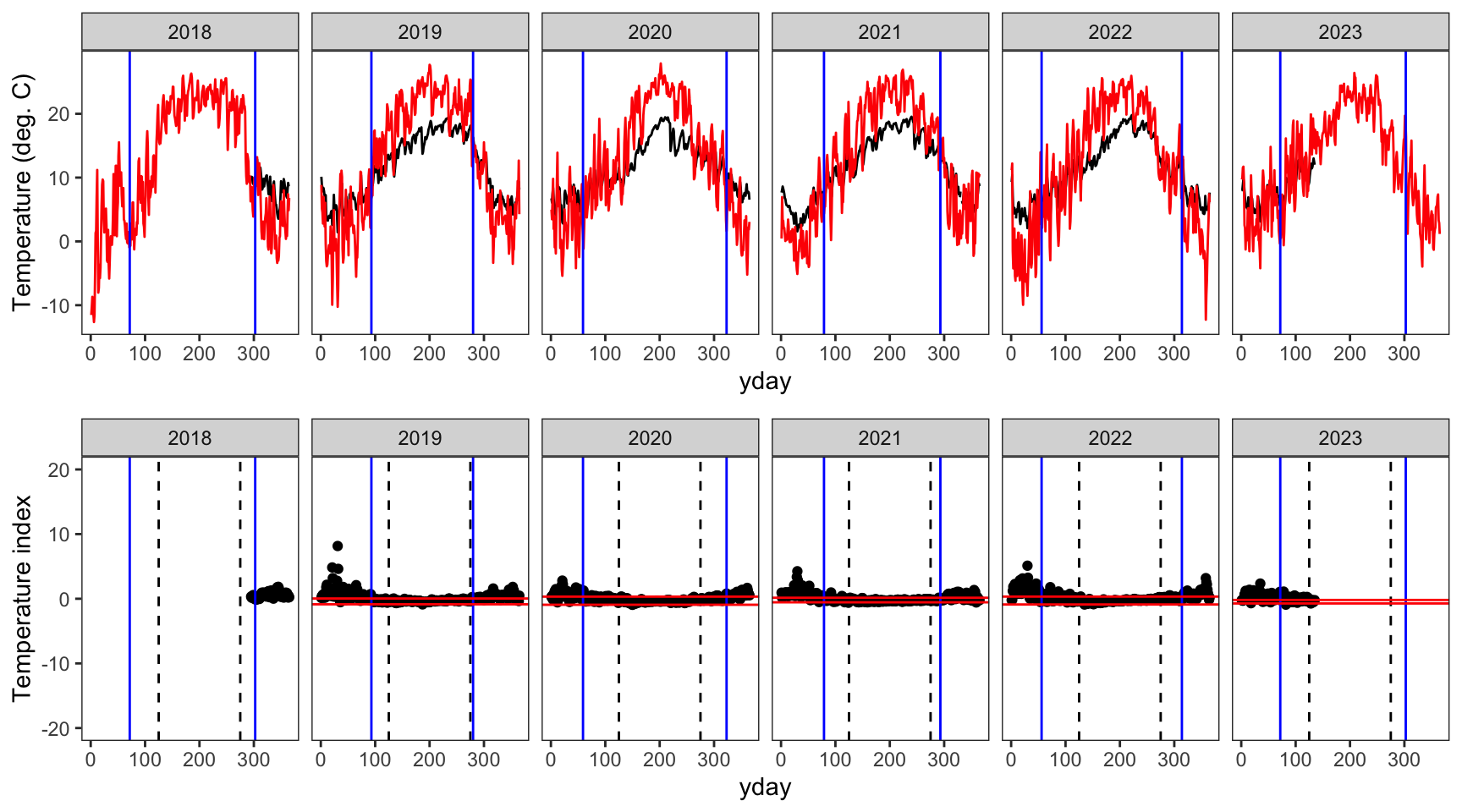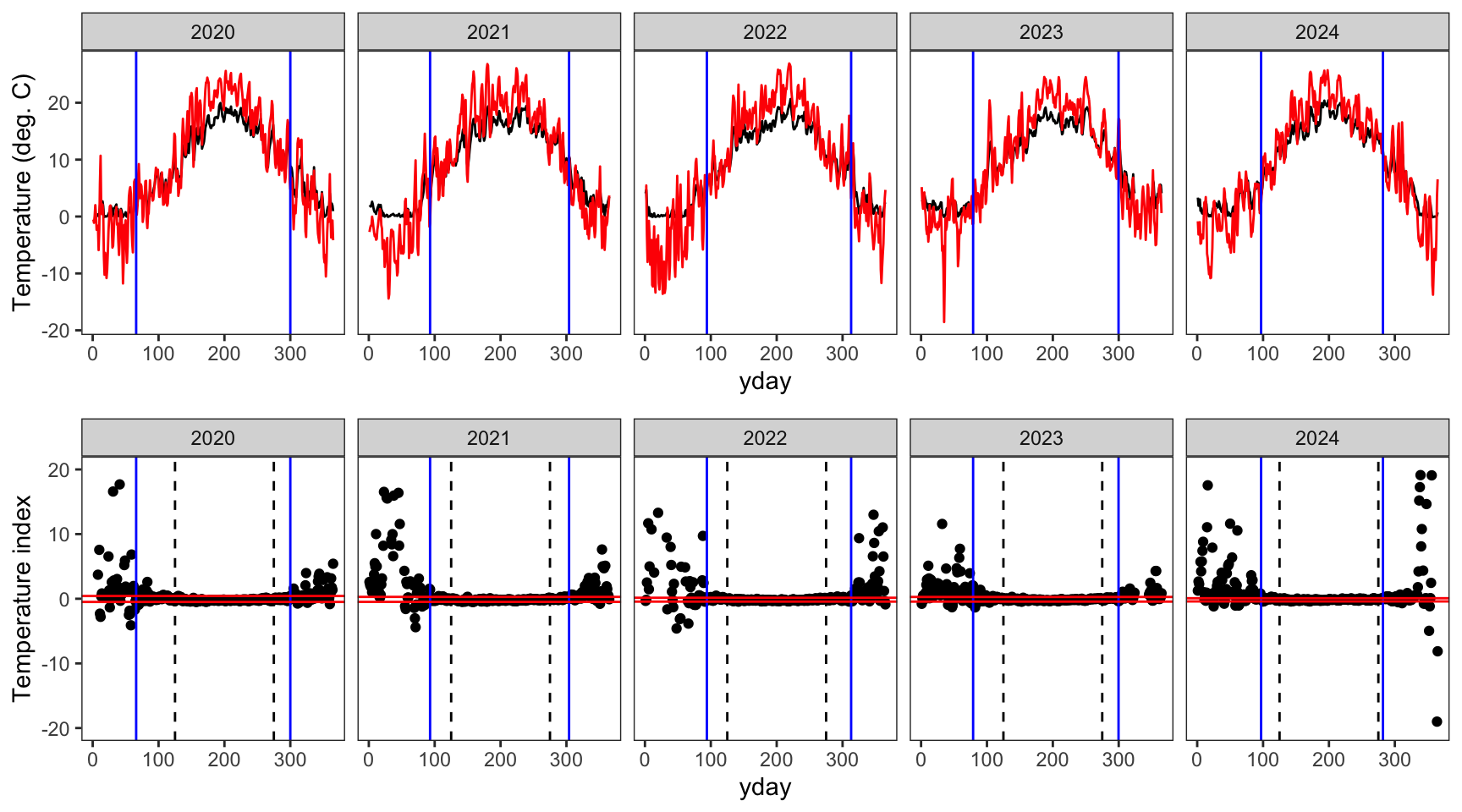 geom_line(data = dat_index %>% filter(site_name == site), aes(x = yday, y = air_temp_mean), color = "red") +