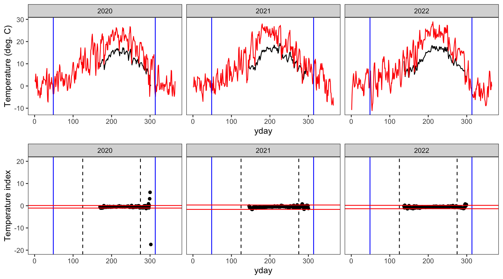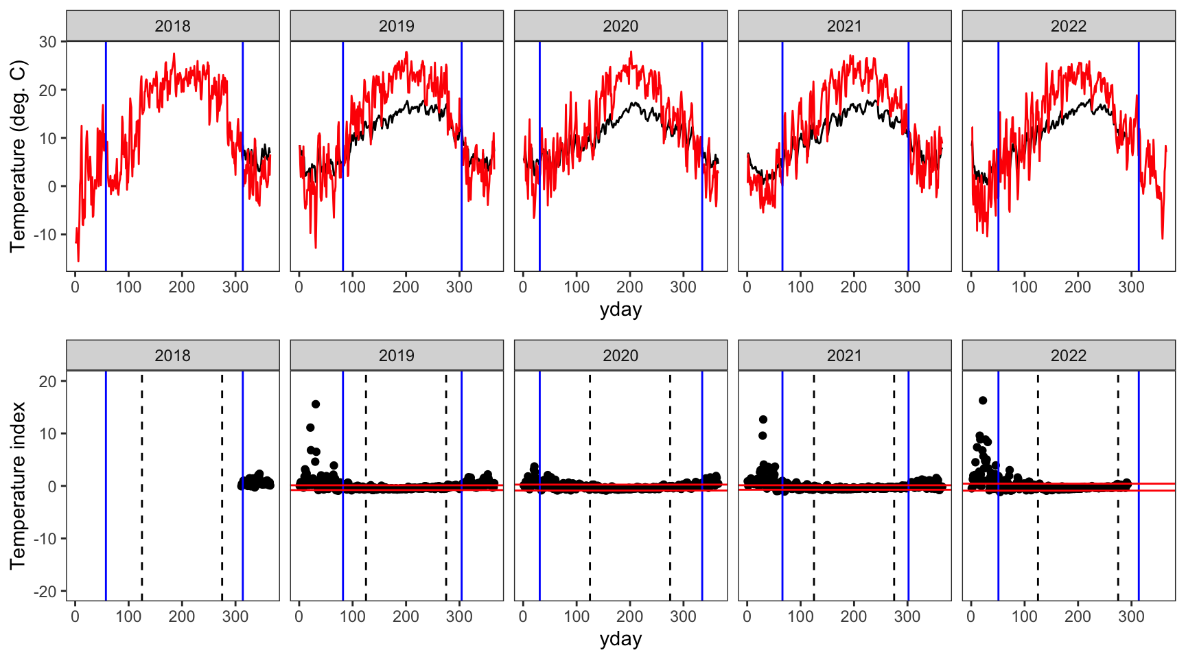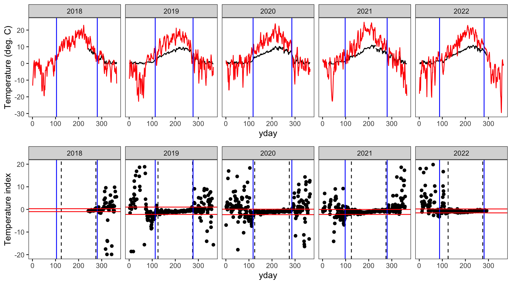geom_line(data = dat_index %>% filter(site_name == site), aes(x = yday, y = air_temp_mean), color = "red") +