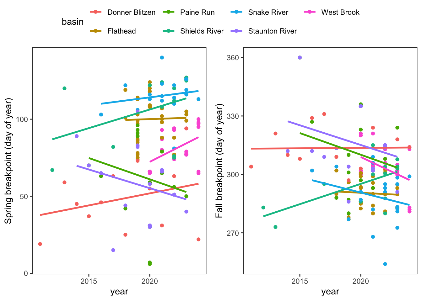 Plot trends in spring and fall breakpoints (only those we directly calculated). We have a ~limited number of years and so this isn’t all that informative