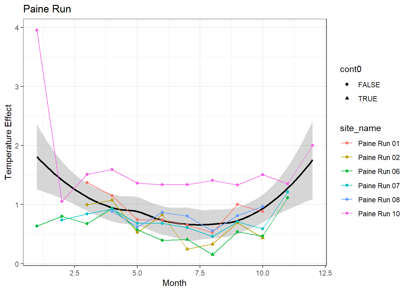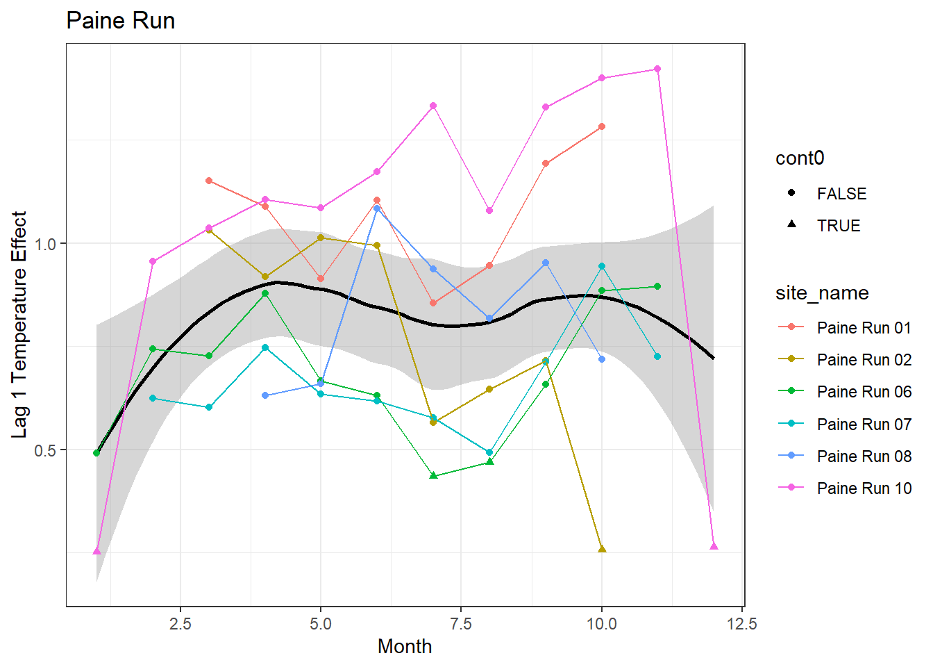 result %>%filter(basin =="Paine Run") %>%ggplot() +geom_smooth(aes(x = month, y = est_mean), color ="black") +geom_point(aes(x = month, y = est_mean, color = site_name, shape = cont0)) +geom_line(aes(x = month, y = est_mean, color = site_name)) +labs(title ="Paine Run", x ="Month", y ="Lag 1 Temperature Effect") +#geom_vline(xintercept = 0, linetype = "dashed") +theme_bw()