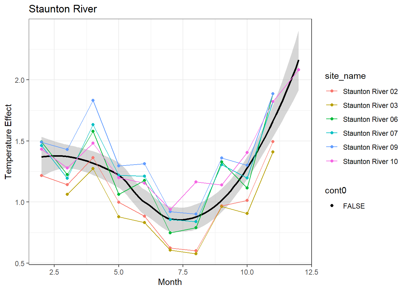 result %>%filter(basin =="Staunton River") %>%ggplot() +geom_smooth(aes(x = month, y = est_mean), color ="black") +geom_point(aes(x = month, y = est_mean, color = site_name, shape = cont0)) +geom_line(aes(x = month, y = est_mean, color = site_name)) +labs(title ="Staunton River", x ="Month", y ="Lag 1 Temperature Effect") +#geom_vline(xintercept = 0, linetype = "dashed") +theme_bw()