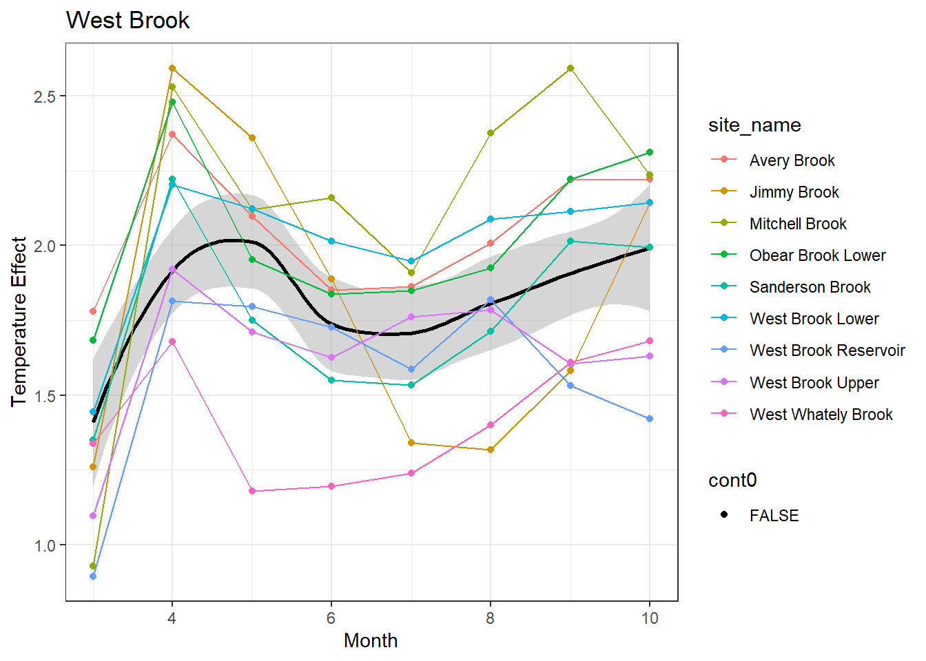 result %>%filter(basin =="West Brook") %>%ggplot() +geom_smooth(aes(x = month, y = est_mean), color ="black") +geom_point(aes(x = month, y = est_mean, color = site_name, shape = cont0)) +geom_line(aes(x = month, y = est_mean, color = site_name)) +labs(title ="West Brook", x ="Month", y ="Lag 1 Temperature Effect") +#geom_vline(xintercept = 0, linetype = "dashed") +theme_bw()