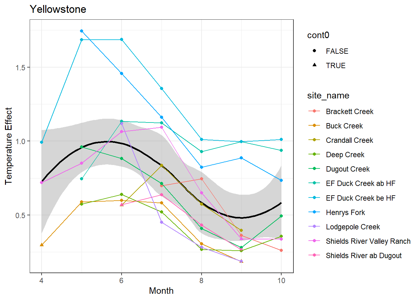 result %>%filter(basin =="Yellowstone") %>%ggplot() +geom_smooth(aes(x = month, y = est_mean), color ="black") +geom_point(aes(x = month, y = est_mean, color = site_name, shape = cont0)) +geom_line(aes(x = month, y = est_mean, color = site_name)) +labs(title ="Yellowstone", x ="Month", y ="Lag 1 Temperature Effect") +#geom_vline(xintercept = 0, linetype = "dashed") +theme_bw()