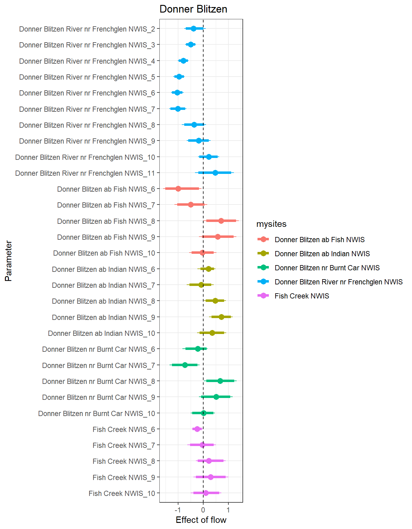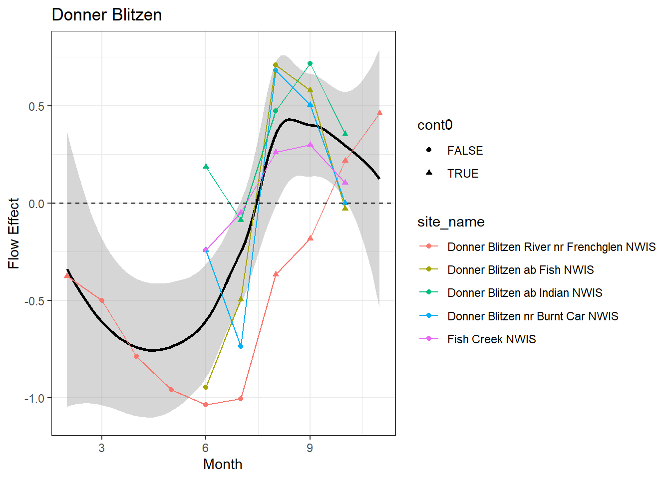 result %>%filter(basin =="Donner Blitzen") %>%ggplot() +geom_smooth(aes(x = month, y = est_mean), color ="black") +geom_point(aes(x = month, y = est_mean, color = site_name, shape = cont0)) +geom_line(aes(x = month, y = est_mean, color = site_name)) +labs(title ="Donner Blitzen", x ="Month", y ="Flow Effect") +geom_hline(yintercept =0, linetype ="dashed") +theme_bw()
