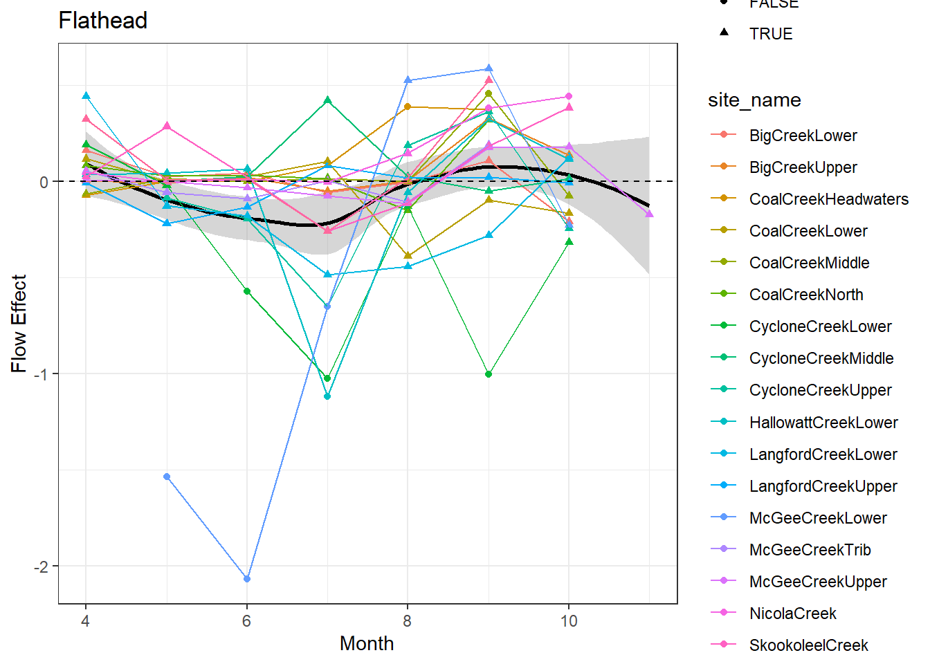 result %>%filter(basin =="Flathead") %>%ggplot() +geom_smooth(aes(x = month, y = est_mean), color ="black") +geom_point(aes(x = month, y = est_mean, color = site_name, shape = cont0)) +geom_line(aes(x = month, y = est_mean, color = site_name)) +labs(title ="Flathead", x ="Month", y ="Flow Effect") +geom_hline(yintercept =0, linetype ="dashed") +theme_bw()