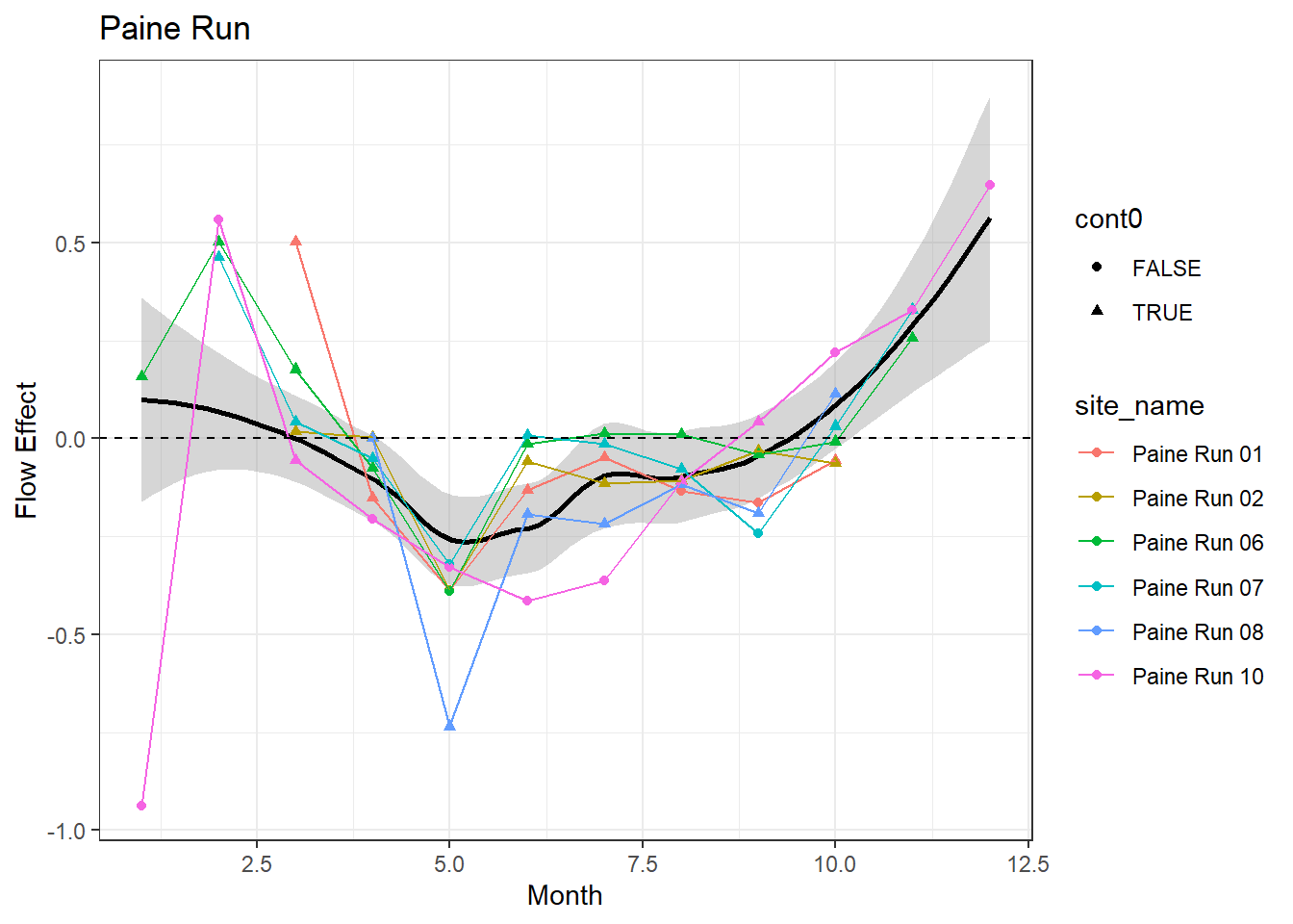 result %>%filter(basin =="Paine Run") %>%ggplot() +geom_smooth(aes(x = month, y = est_mean), color ="black") +geom_point(aes(x = month, y = est_mean, color = site_name, shape = cont0)) +geom_line(aes(x = month, y = est_mean, color = site_name)) +labs(title ="Paine Run", x ="Month", y ="Flow Effect") +geom_hline(yintercept =0, linetype ="dashed") +theme_bw()