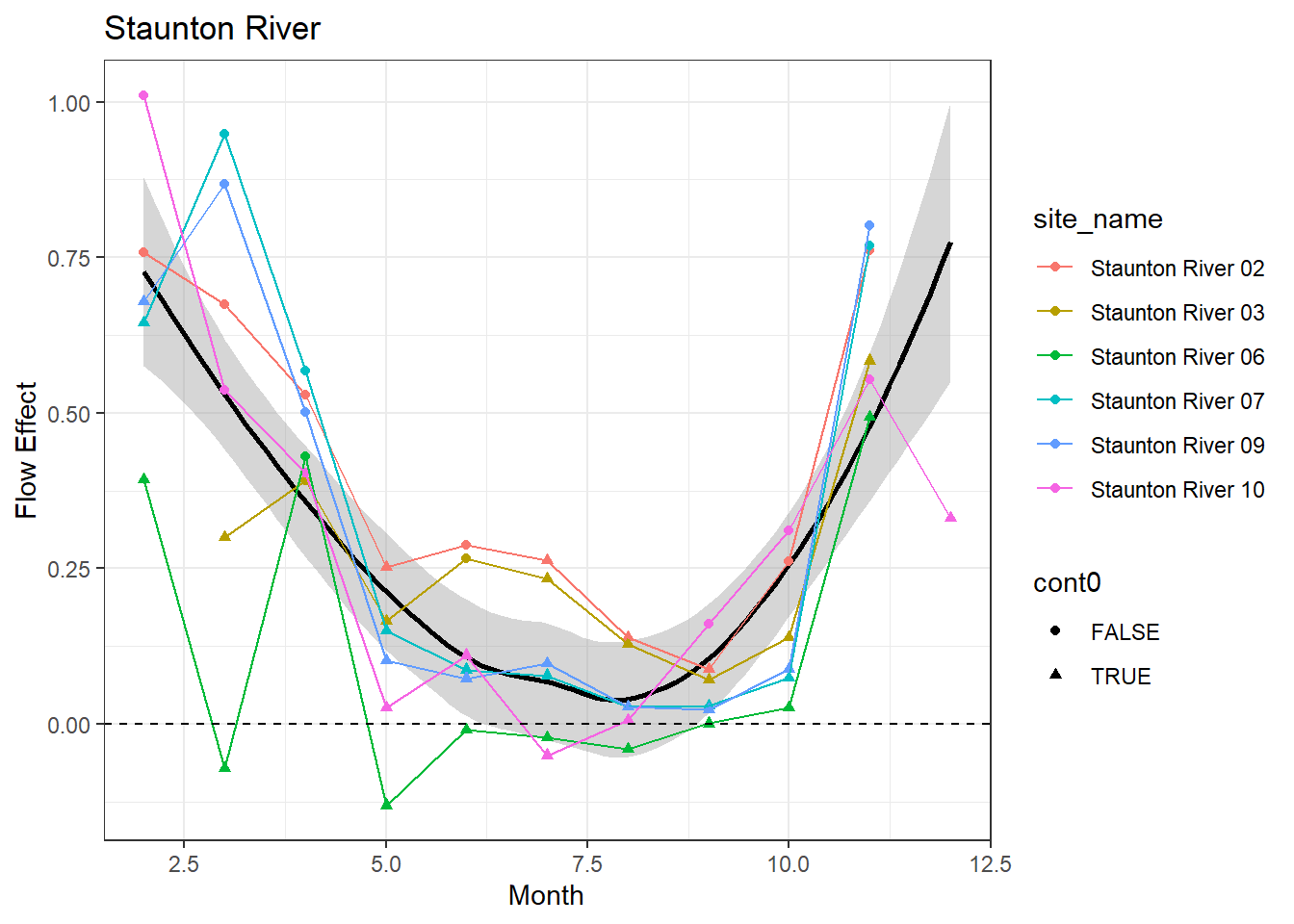 result %>%filter(basin =="Staunton River") %>%ggplot() +geom_smooth(aes(x = month, y = est_mean), color ="black") +geom_point(aes(x = month, y = est_mean, color = site_name, shape = cont0)) +geom_line(aes(x = month, y = est_mean, color = site_name)) +labs(title ="Staunton River", x ="Month", y ="Flow Effect") +geom_hline(yintercept =0, linetype ="dashed") +theme_bw()