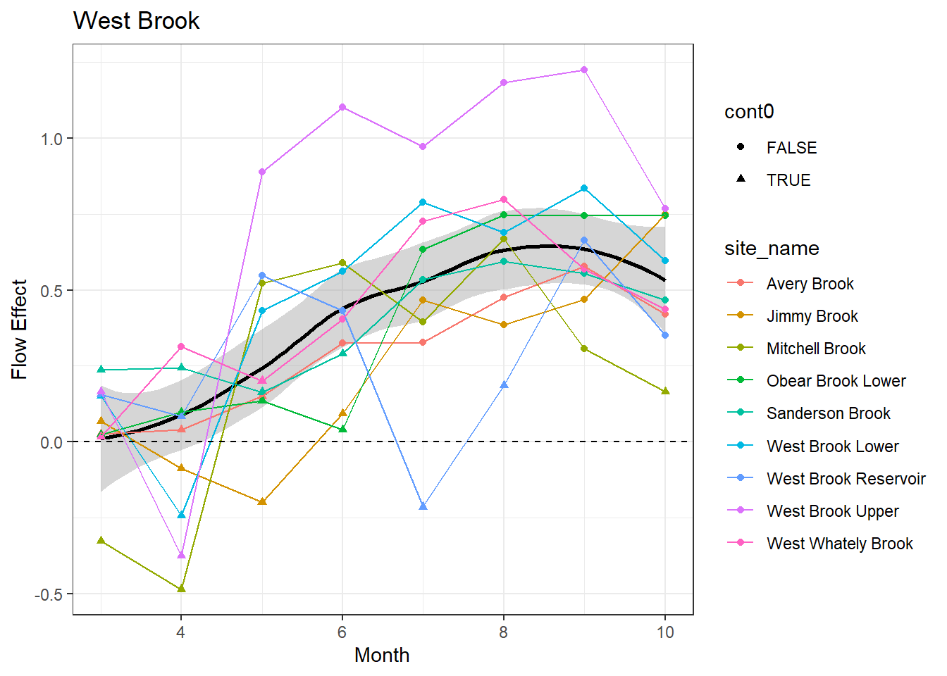 result %>%filter(basin =="West Brook") %>%ggplot() +geom_smooth(aes(x = month, y = est_mean), color ="black") +geom_point(aes(x = month, y = est_mean, color = site_name, shape = cont0)) +geom_line(aes(x = month, y = est_mean, color = site_name)) +labs(title ="West Brook", x ="Month", y ="Flow Effect") +geom_hline(yintercept =0, linetype ="dashed") +theme_bw()