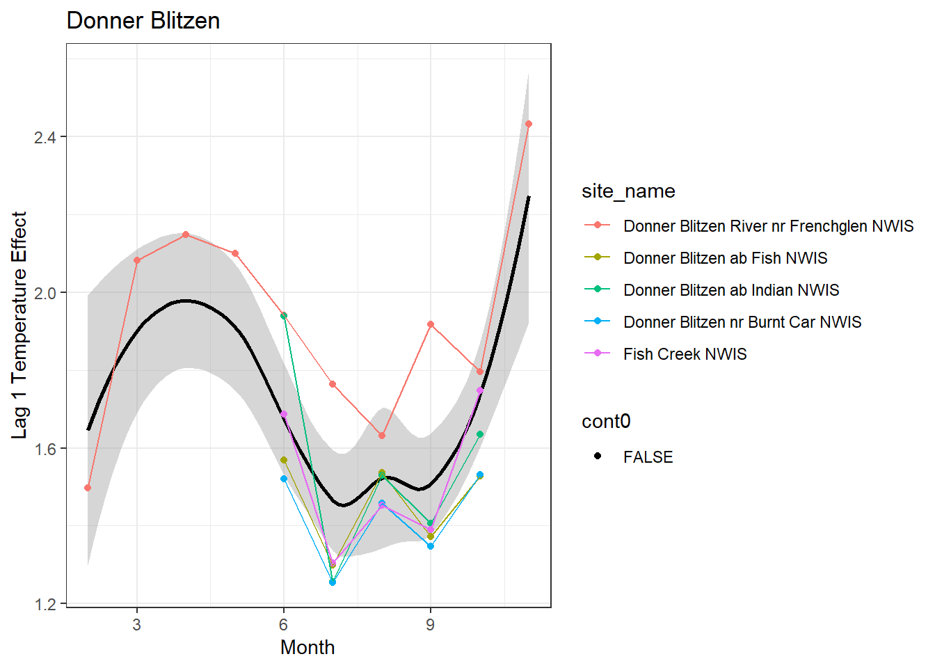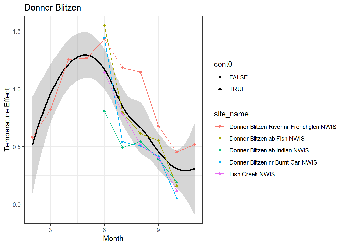 result %>%filter(basin =="Donner Blitzen") %>%ggplot() +geom_smooth(aes(x = month, y = est_mean), color ="black") +geom_point(aes(x = month, y = est_mean, color = site_name, shape = cont0)) +geom_line(aes(x = month, y = est_mean, color = site_name)) +labs(title ="Donner Blitzen", x ="Month", y ="Lag 1 Temperature Effect") +#geom_vline(xintercept = 0, linetype = "dashed") +theme_bw()