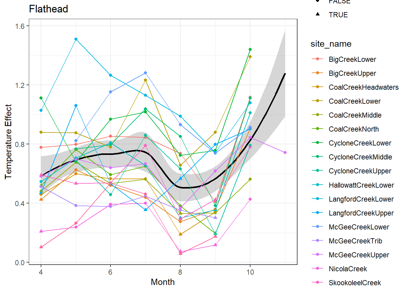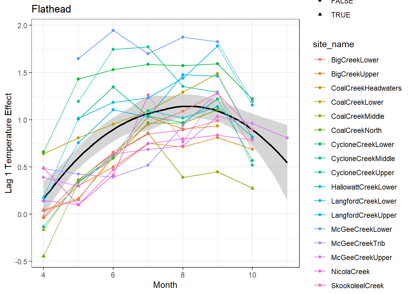 result %>%filter(basin =="Flathead") %>%ggplot() +geom_smooth(aes(x = month, y = est_mean), color ="black") +geom_point(aes(x = month, y = est_mean, color = site_name, shape = cont0)) +geom_line(aes(x = month, y = est_mean, color = site_name)) +labs(title ="Flathead", x ="Month", y ="Lag 1 Temperature Effect") +#geom_vline(xintercept = 0, linetype = "dashed") +theme_bw()