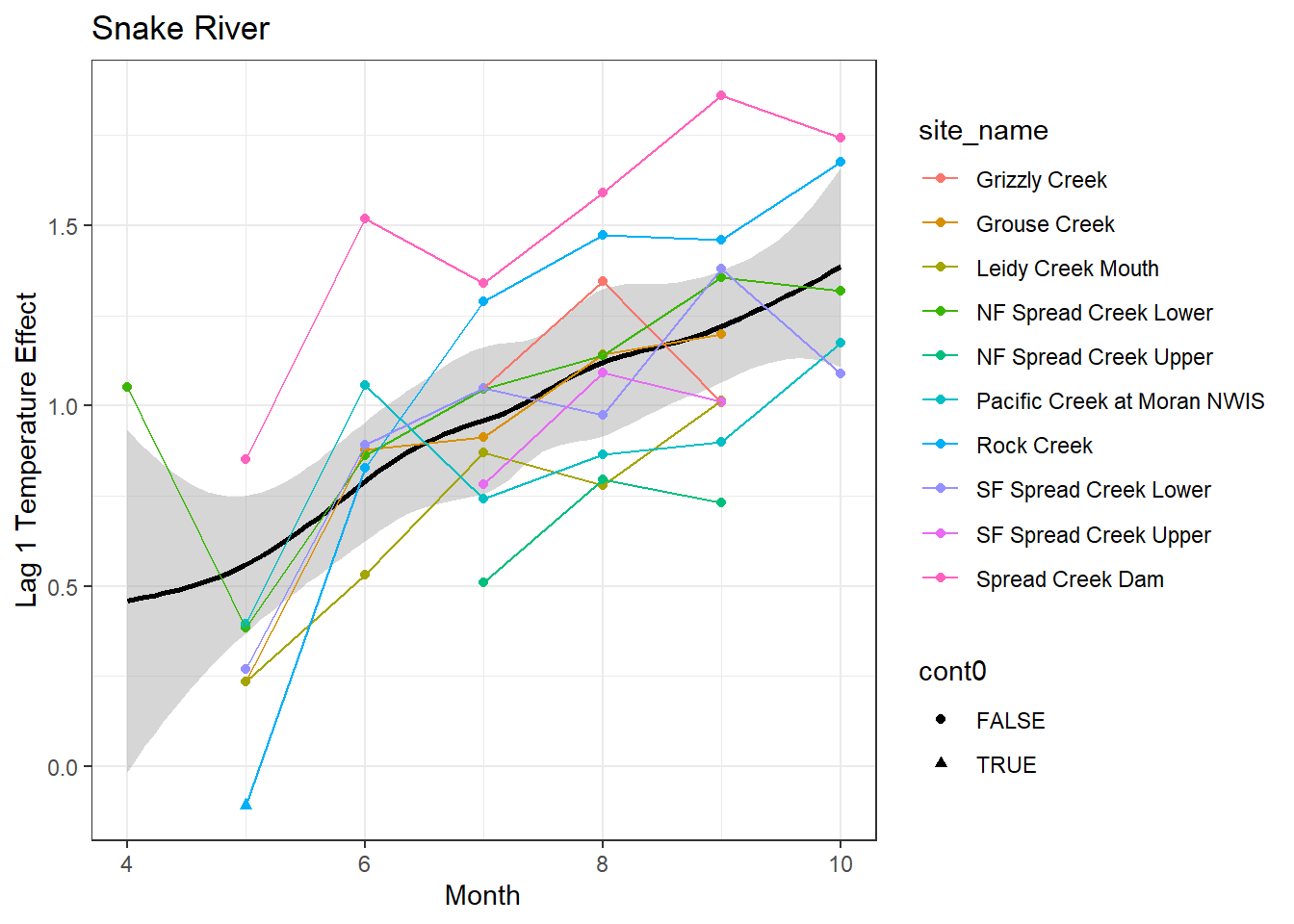 result %>%filter(basin =="Snake River") %>%ggplot() +geom_smooth(aes(x = month, y = est_mean), color ="black") +geom_point(aes(x = month, y = est_mean, color = site_name, shape = cont0)) +geom_line(aes(x = month, y = est_mean, color = site_name)) +labs(title ="Snake River", x ="Month", y ="Lag 1 Temperature Effect") +#geom_vline(xintercept = 0, linetype = "dashed") +theme_bw()