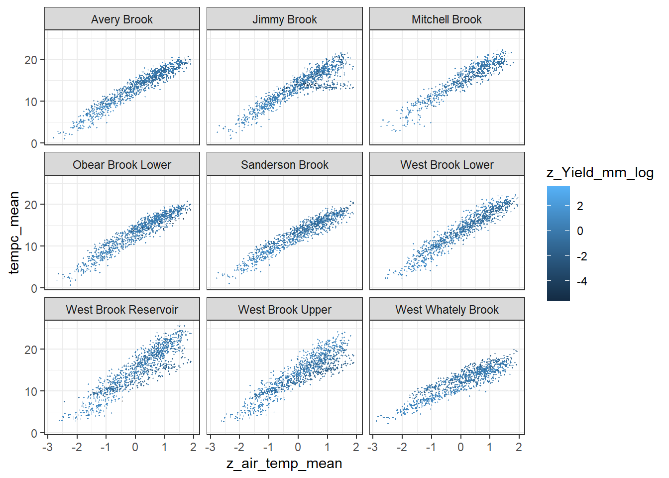 dat <-read_csv("data/EcoDrought_FlowTempData_formatted.csv") %>%mutate(month =month(date)) #%>%#filter(basin == "West Brook")# # redo basin and site codes# dat <- dat %>% arrange(basin, site_name, year, yday)# sitecodes <- tibble(site_name = unique(dat$site_name), site_code = 1:length(unique(dat$site_name)))# monthcodes <- tibble(month = unique(dat$month), month_code = 1:length(unique(dat$month)))# basincodes <- tibble(basin = unique(dat$basin), basin_code = 1:length(unique(dat$basin)))# # dat <- dat %>%# select(-c(site_code, basin_code)) %>%# left_join(sitecodes) %>%# left_join(monthcodes) %>%# left_join(basincodes) %>%# mutate(rowNum = 1:nrow(.))dat