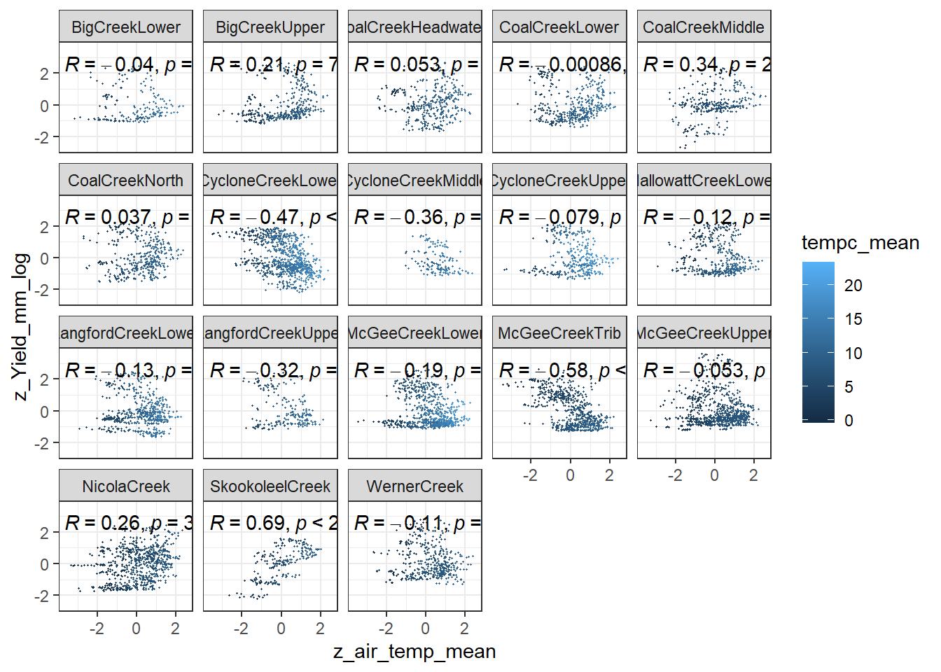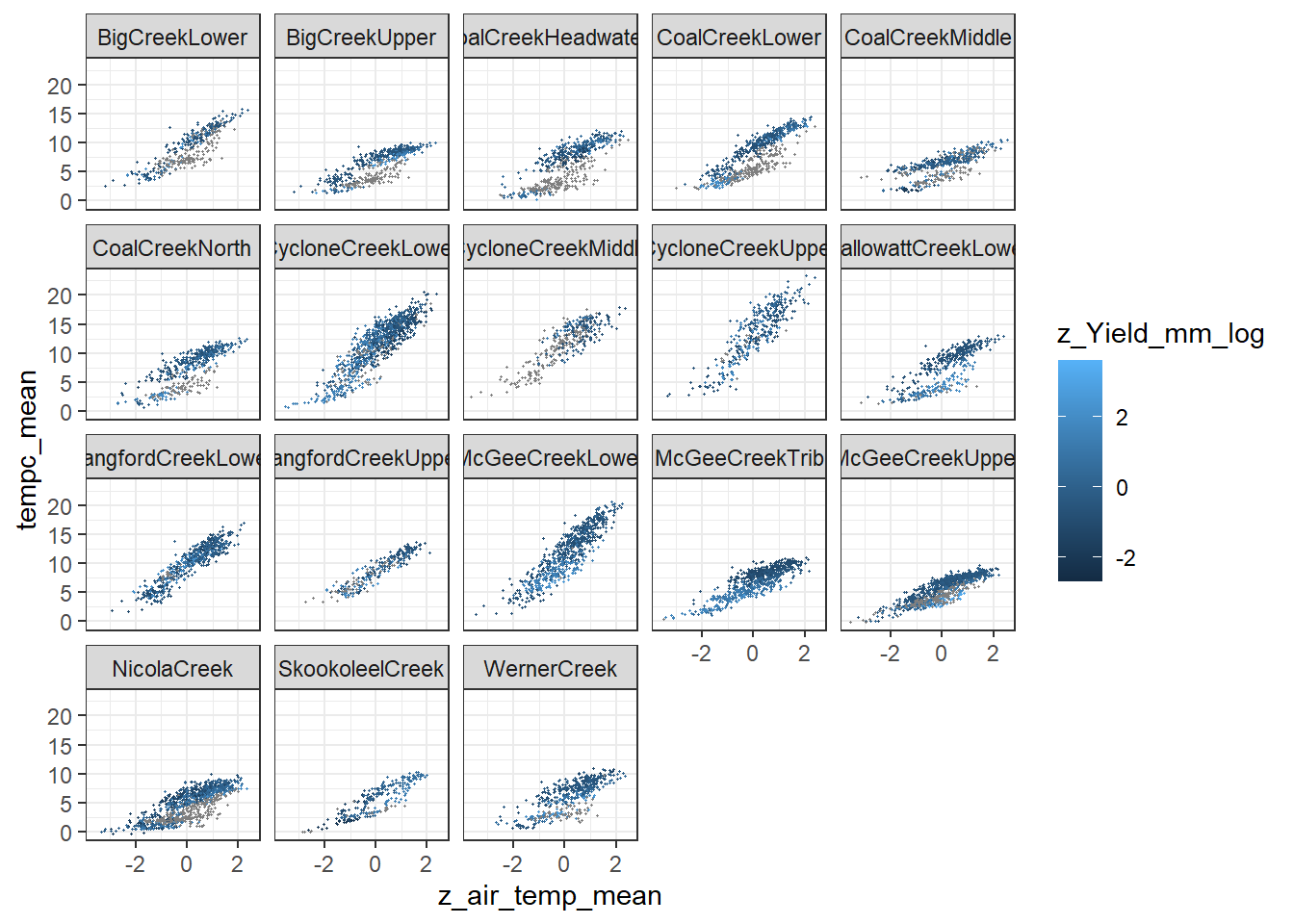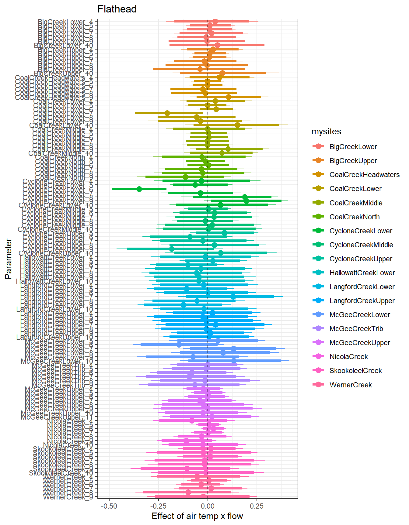 It’s not clear how informative monthly intercepts are as the air temp and flow data are standardized by site, not by site AND month. Regardless, some interesting patterns.