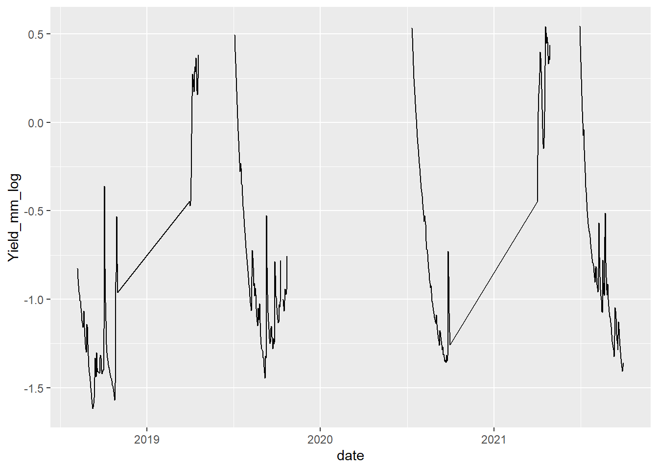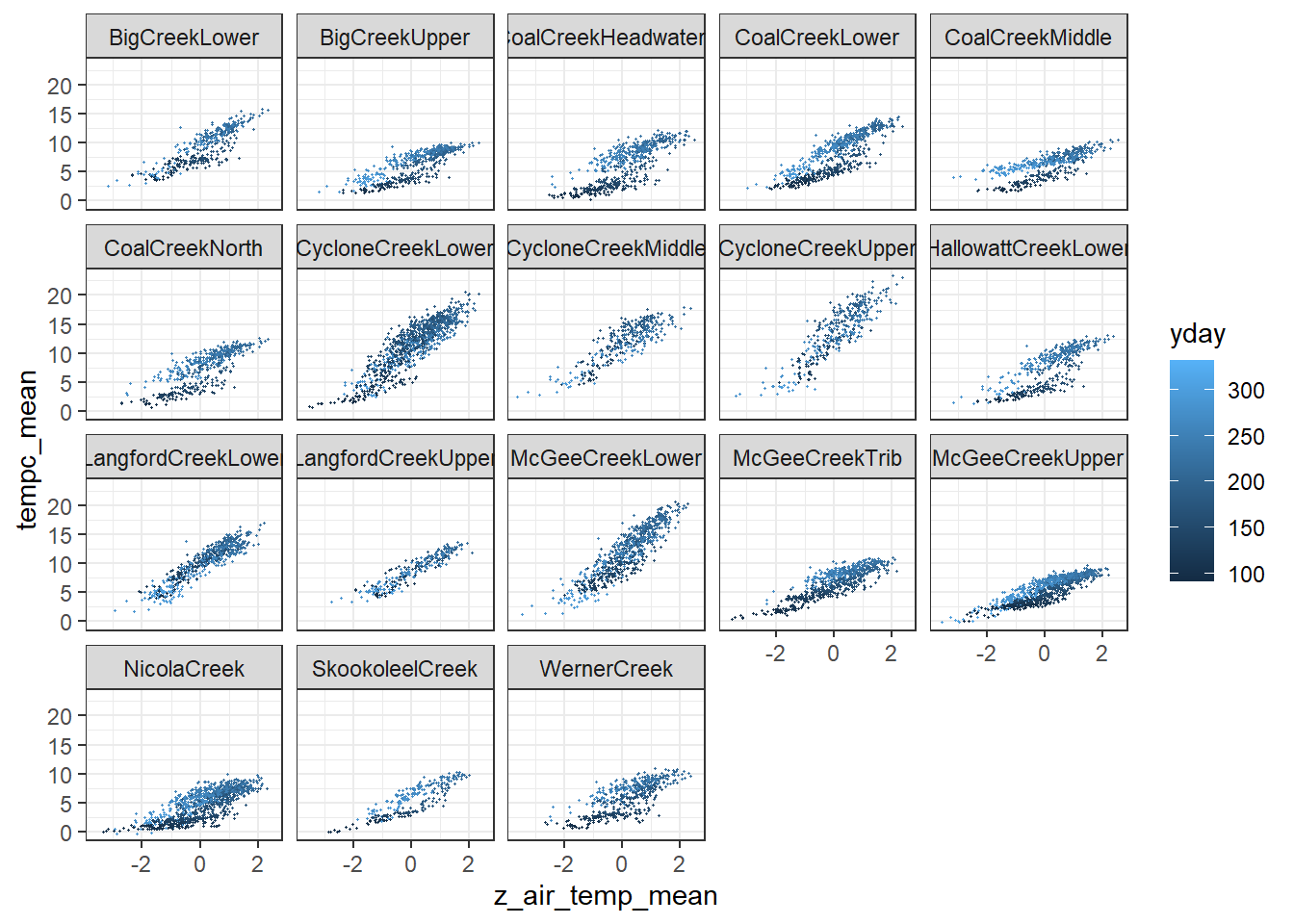 # identify site-month-years to keep: those with >= 25 days of datakeeps <- dat %>%mutate(site_year_month =paste(site_name, year, month, sep ="_")) %>%group_by(site_year_month) %>%summarize(nobs =n()) %>%ungroup() %>%filter(nobs >=20)# filter data to keeps (~complete months)dat2 <- dat %>%mutate(site_year_month =paste(site_name, year, month, sep ="_")) %>%filter(site_year_month %in% keeps$site_year_month) %>%mutate(rowNum =1:nrow(.))# are the number of unique sites, basins, and months the same between unfiltered and filtered datasets?length(unique(dat$site_name))