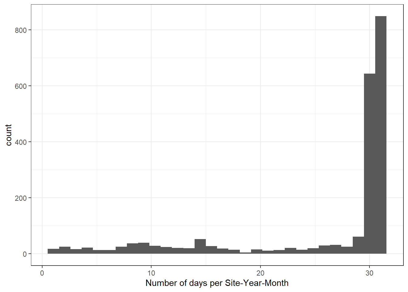 Most Site-Year-Months are relatively complete (>29 days of data). But there are many that are incomplete, which likely affects convergence/accurate parameter estimation. Remove these periods and re-do basin, site, and month codes.