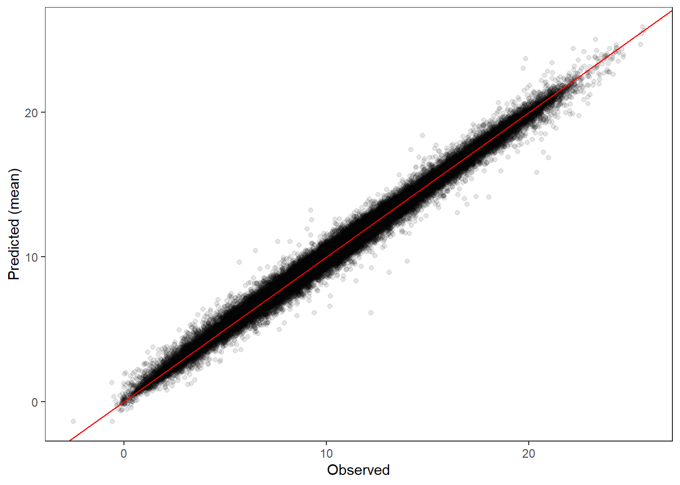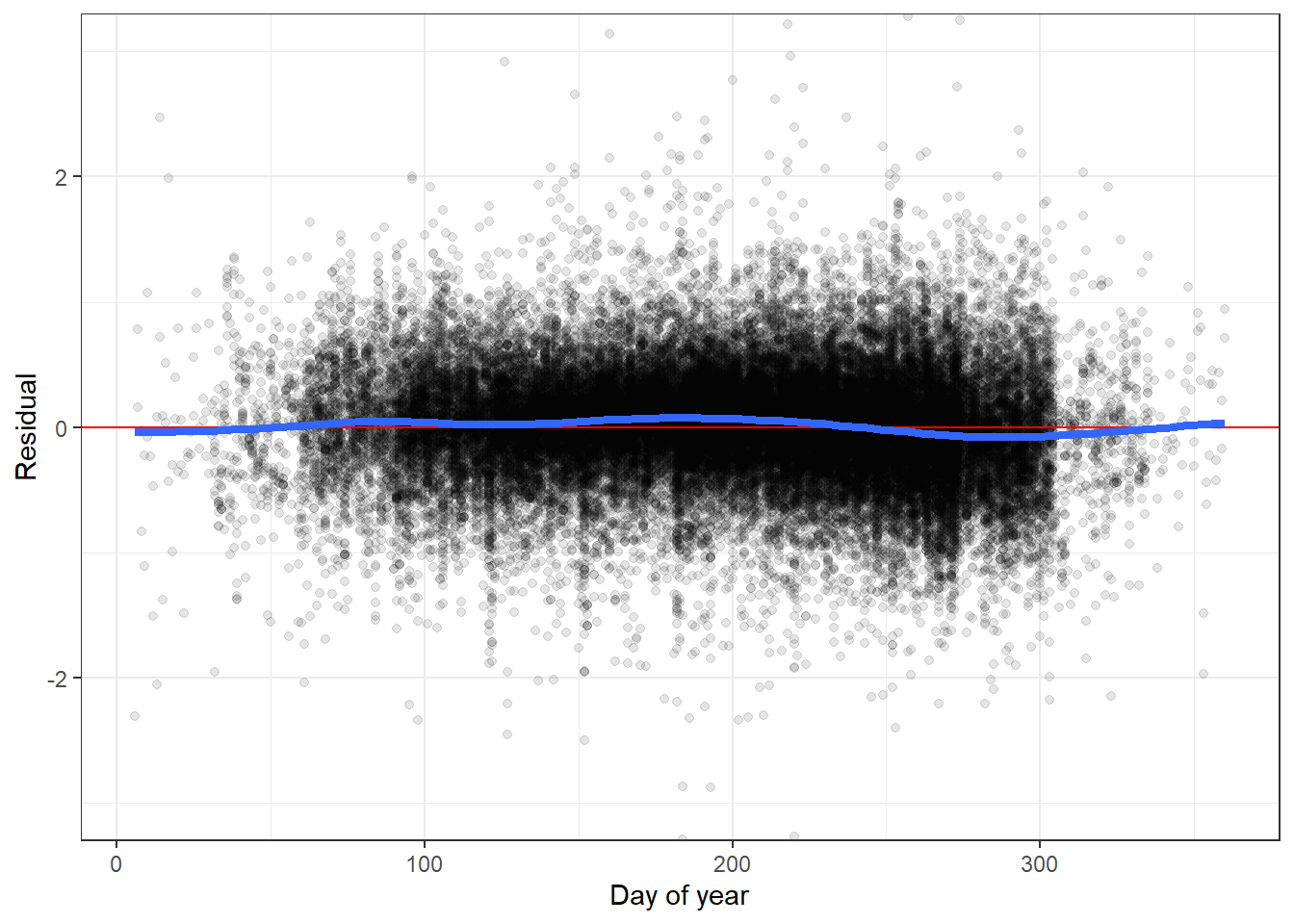 tibble(site_name = dat$site_name, year = dat$year, yday = dat$yday, resid =c(ppdat_obs_mean - ppdat_exp_mean)) %>%ggplot(aes(x = yday, y = resid)) +geom_point(alpha =0.1) +geom_hline(yintercept =c(0), color ="red") +geom_smooth(se =FALSE, linewidth =1.5) +theme_bw() +#theme(panel.grid = element_blank()) +xlab("Day of year") +ylab("Residual") +#facet_wrap(~site_name) + coord_cartesian(ylim =c(-3,3)) #+ facet_wrap(~year)