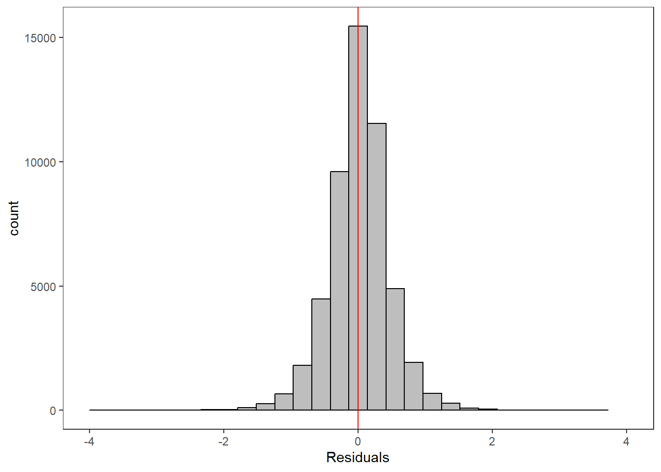 ggplot() +geom_histogram(aes(x =c(ppdat_obs_mean - ppdat_exp_mean)), color ="black", fill ="grey") +xlab("Residuals") +theme_bw() +theme(panel.grid =element_blank()) +geom_vline(xintercept =0, color ="red") +xlim(-4,4)