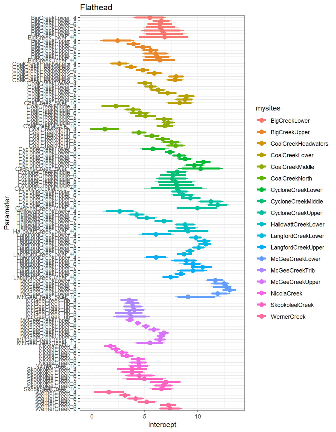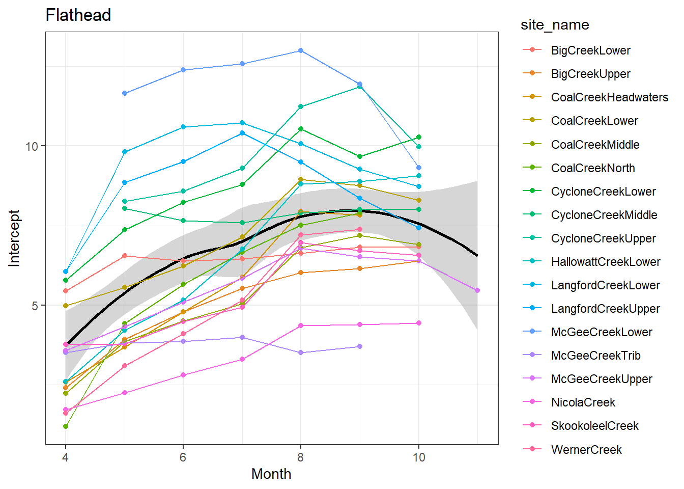 result %>%filter(basin =="Flathead") %>%ggplot() +geom_smooth(aes(x = month, y = est_mean), color ="black") +geom_point(aes(x = month, y = est_mean, color = site_name)) +geom_line(aes(x = month, y = est_mean, color = site_name)) +labs(title ="Flathead", x ="Month", y ="Intercept") +#geom_vline(xintercept = 0, linetype = "dashed") +theme_bw()
