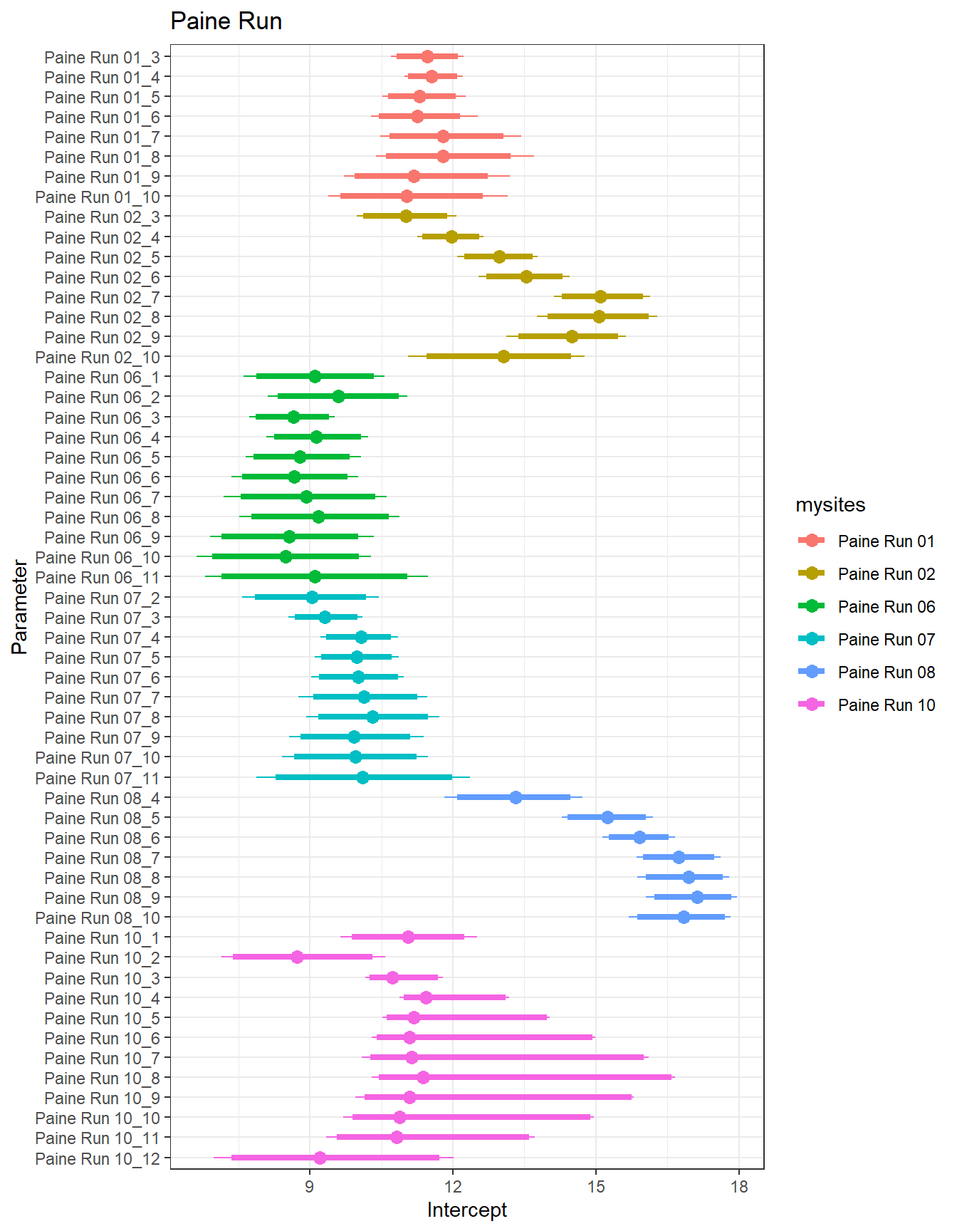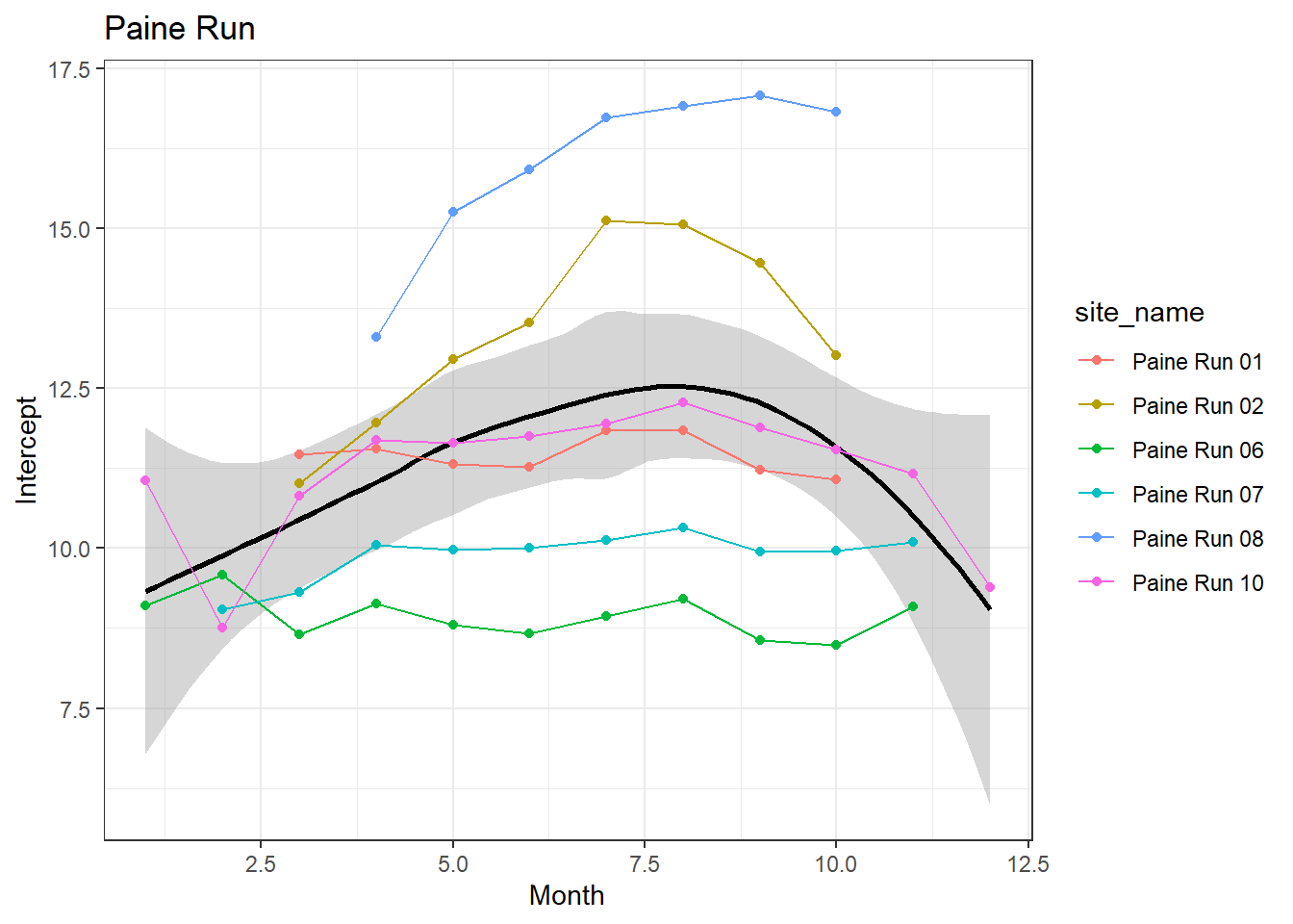 result %>%filter(basin =="Paine Run") %>%ggplot() +geom_smooth(aes(x = month, y = est_mean), color ="black") +geom_point(aes(x = month, y = est_mean, color = site_name)) +geom_line(aes(x = month, y = est_mean, color = site_name)) +labs(title ="Paine Run", x ="Month", y ="Intercept") +#geom_vline(xintercept = 0, linetype = "dashed") +theme_bw()