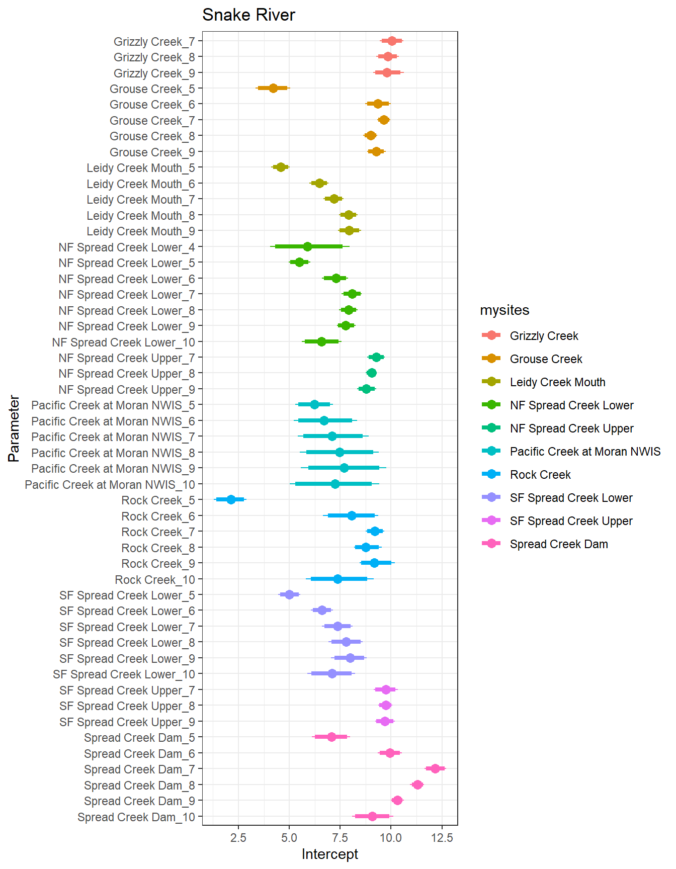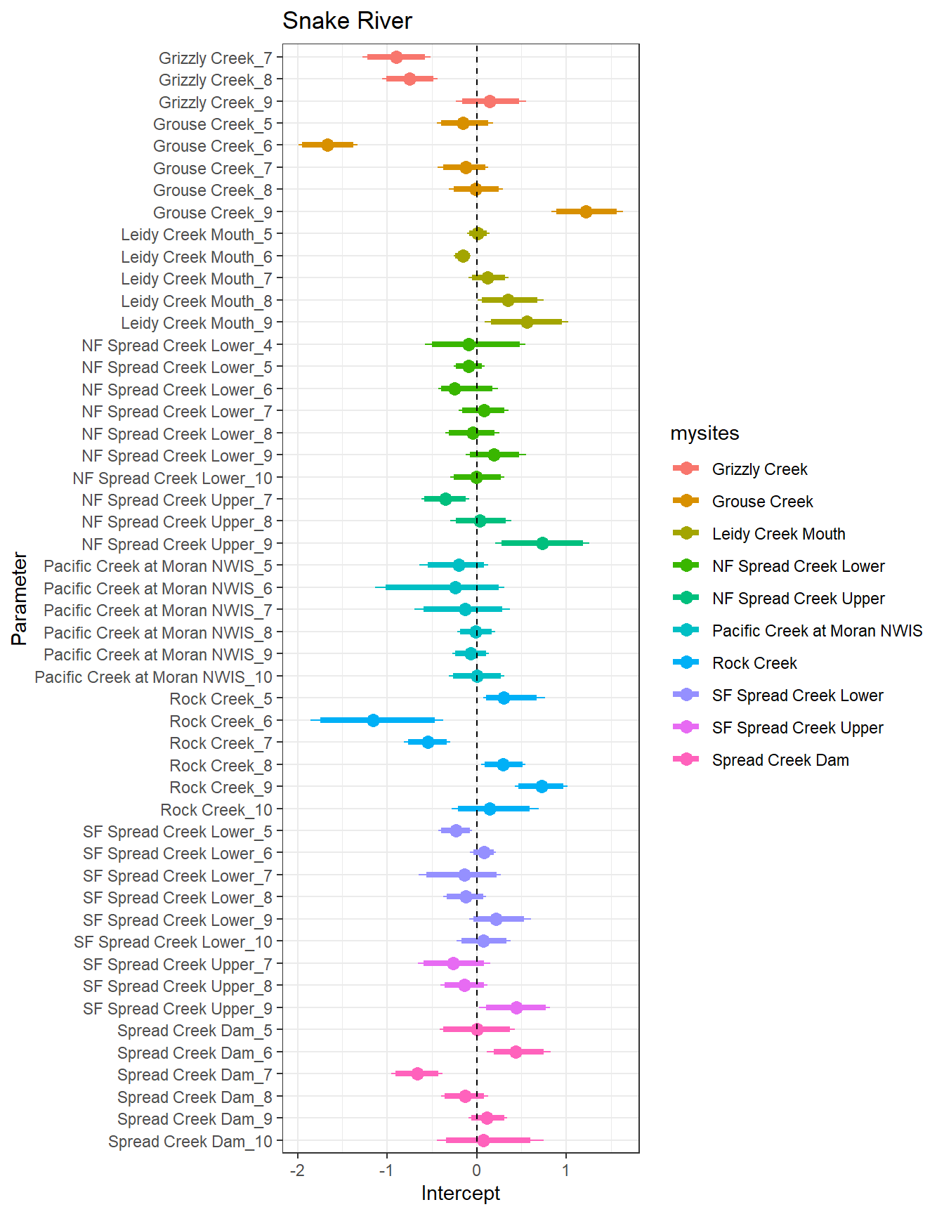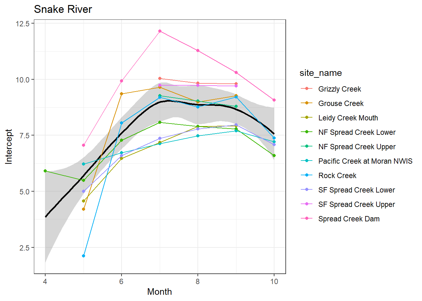 result %>%filter(basin =="Snake River") %>%ggplot() +geom_smooth(aes(x = month, y = est_mean), color ="black") +geom_point(aes(x = month, y = est_mean, color = site_name)) +geom_line(aes(x = month, y = est_mean, color = site_name)) +labs(title ="Snake River", x ="Month", y ="Intercept") +#geom_vline(xintercept = 0, linetype = "dashed") +theme_bw()