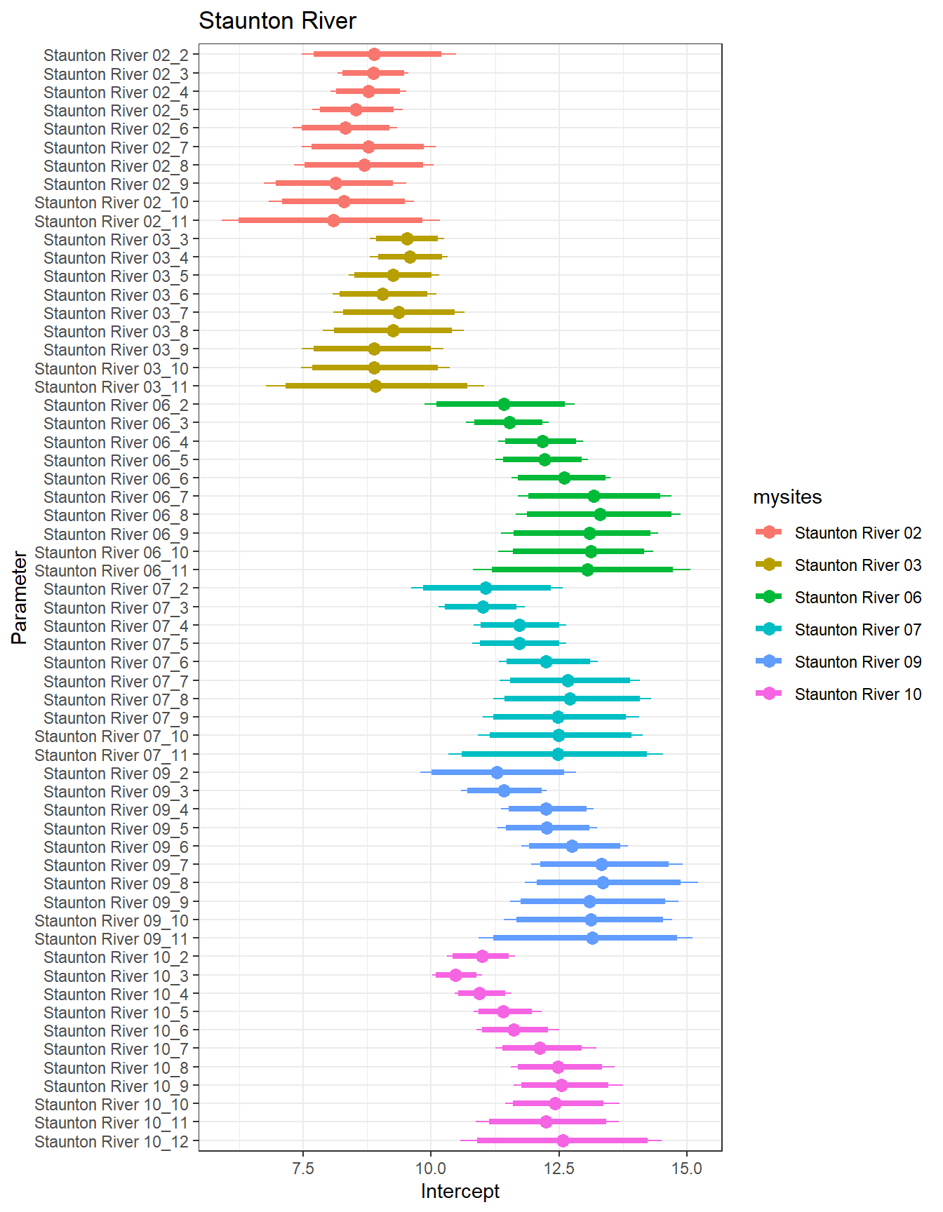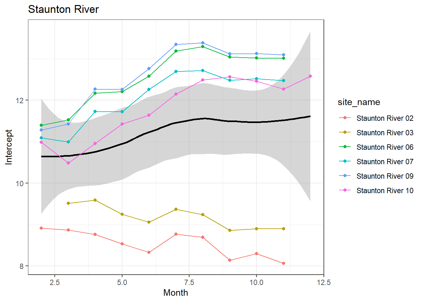 result %>%filter(basin =="Staunton River") %>%ggplot() +geom_smooth(aes(x = month, y = est_mean), color ="black") +geom_point(aes(x = month, y = est_mean, color = site_name)) +geom_line(aes(x = month, y = est_mean, color = site_name)) +labs(title ="Staunton River", x ="Month", y ="Intercept") +#geom_vline(xintercept = 0, linetype = "dashed") +theme_bw()