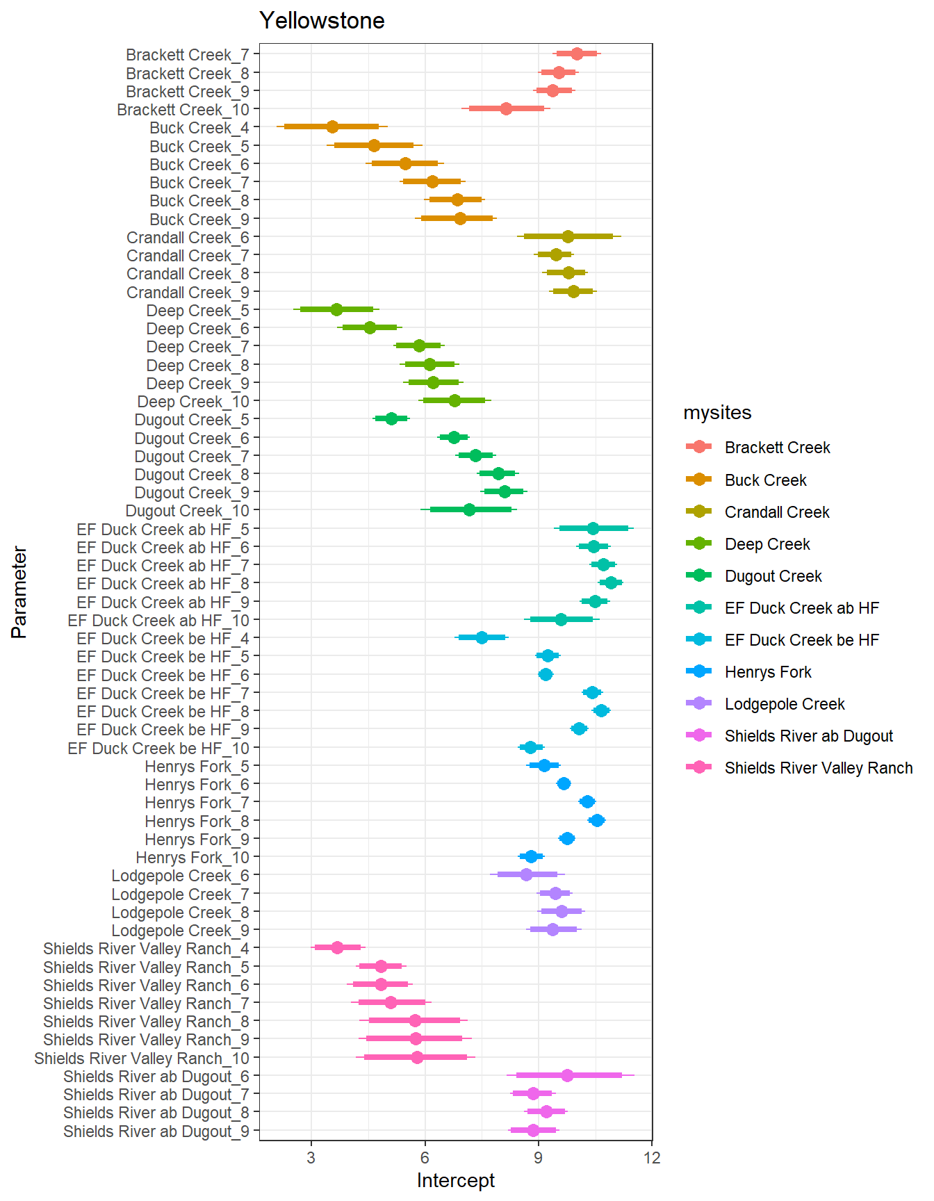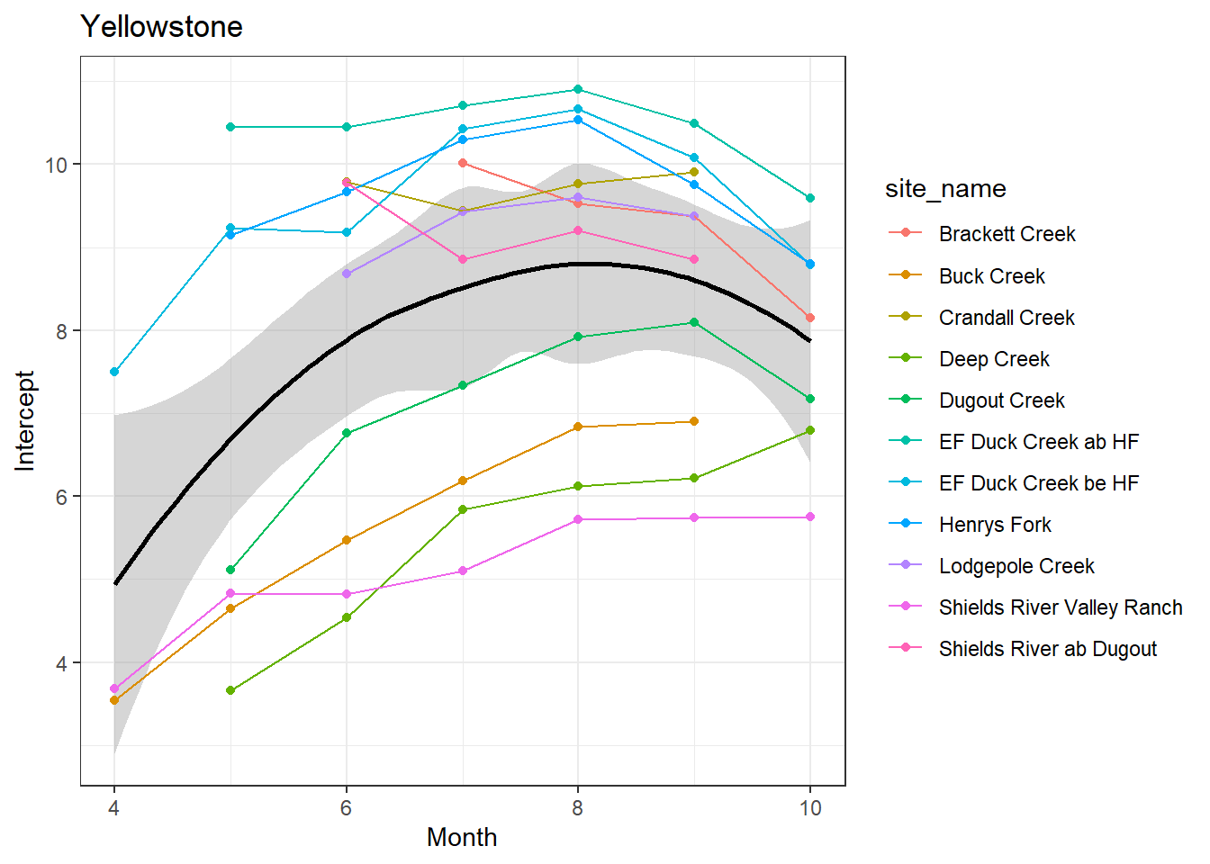 result %>%filter(basin =="Yellowstone") %>%ggplot() +geom_smooth(aes(x = month, y = est_mean), color ="black") +geom_point(aes(x = month, y = est_mean, color = site_name)) +geom_line(aes(x = month, y = est_mean, color = site_name)) +labs(title ="Yellowstone", x ="Month", y ="Intercept") +#geom_vline(xintercept = 0, linetype = "dashed") +theme_bw()