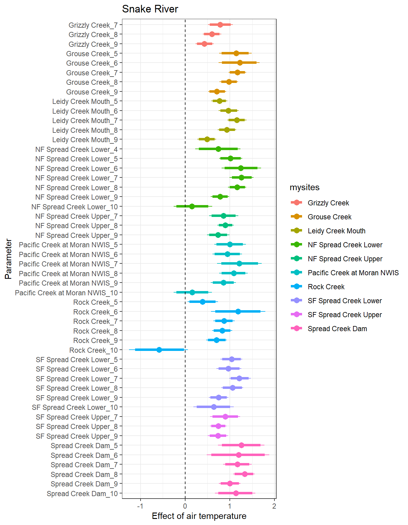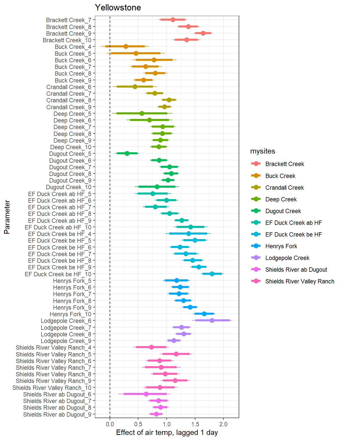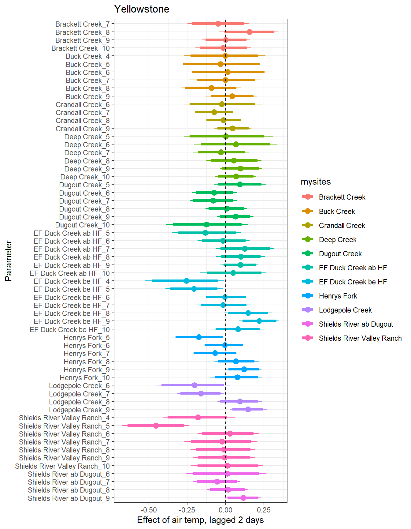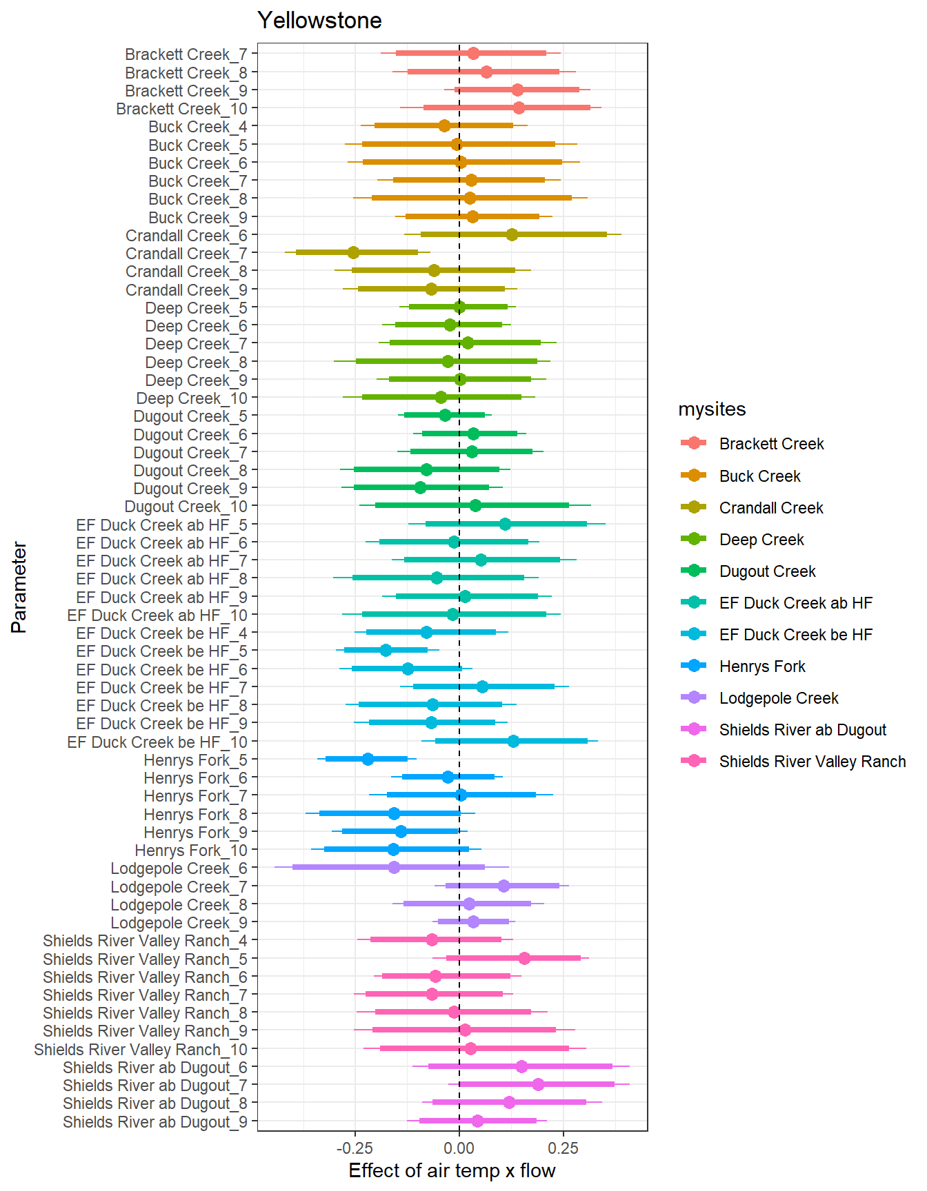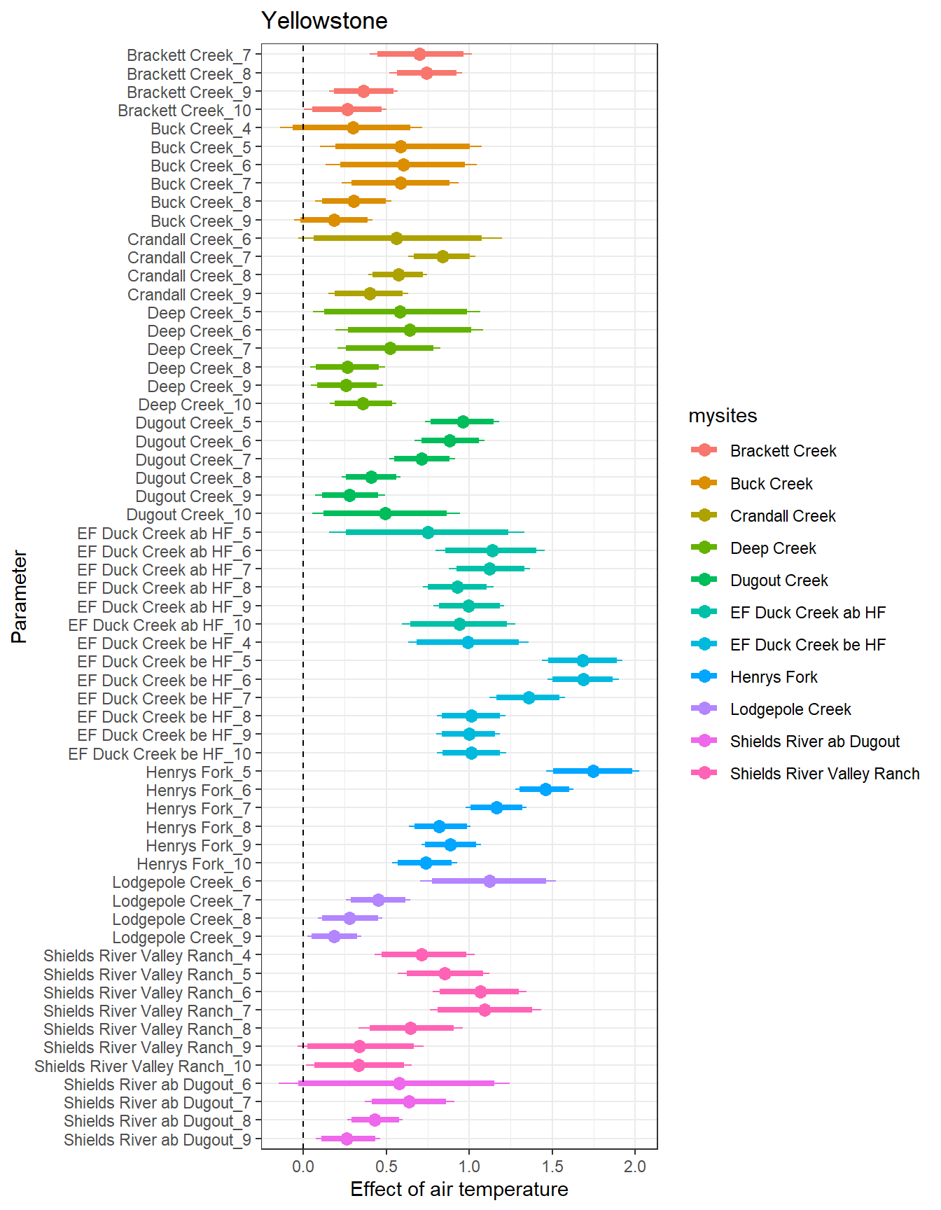 # extract relevant parameter namesallpars2 <-row.names(param.summary)temppars <- allpars2[grepl("B5", allpars2)]temppars <- temppars[-length(temppars)]# get numeric components (site code and month)m <-str_match(temppars, "\\[(\\d+),(\\d+)\\]")# create tibble with means and 95% credible intervalsresult <-tibble(site_code =as.integer(m[,2]),month =as.integer(m[,3]),est_mean = param.summary[temppars,1],est_low = param.summary[temppars,3],est_high = param.summary[temppars,7] ) %>%mutate(cont0 =contains_zero(est_low, est_high)) %>%left_join(sitecodes) %>%left_join(sitemonths) %>%filter(!is.na(site_month_code)) %>%mutate(site_name =factor(site_name, levels =unique(dat$site_name)))