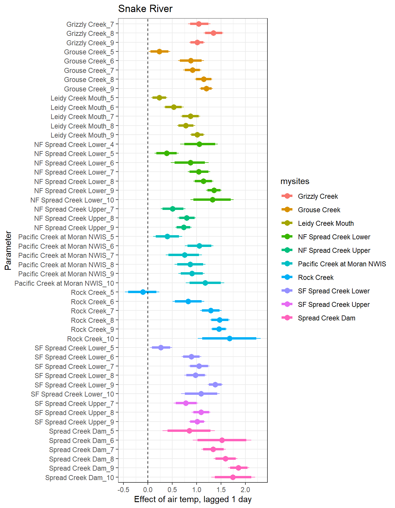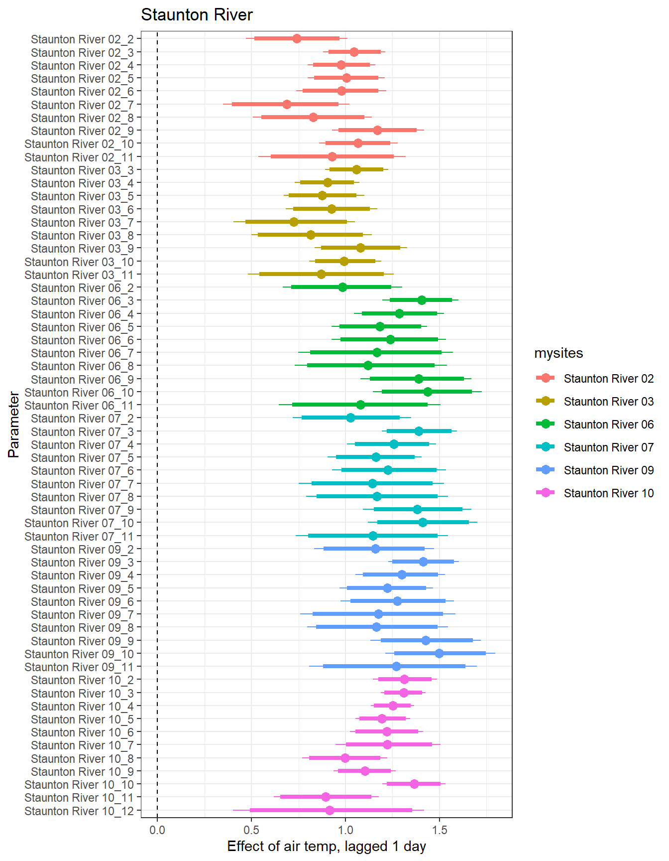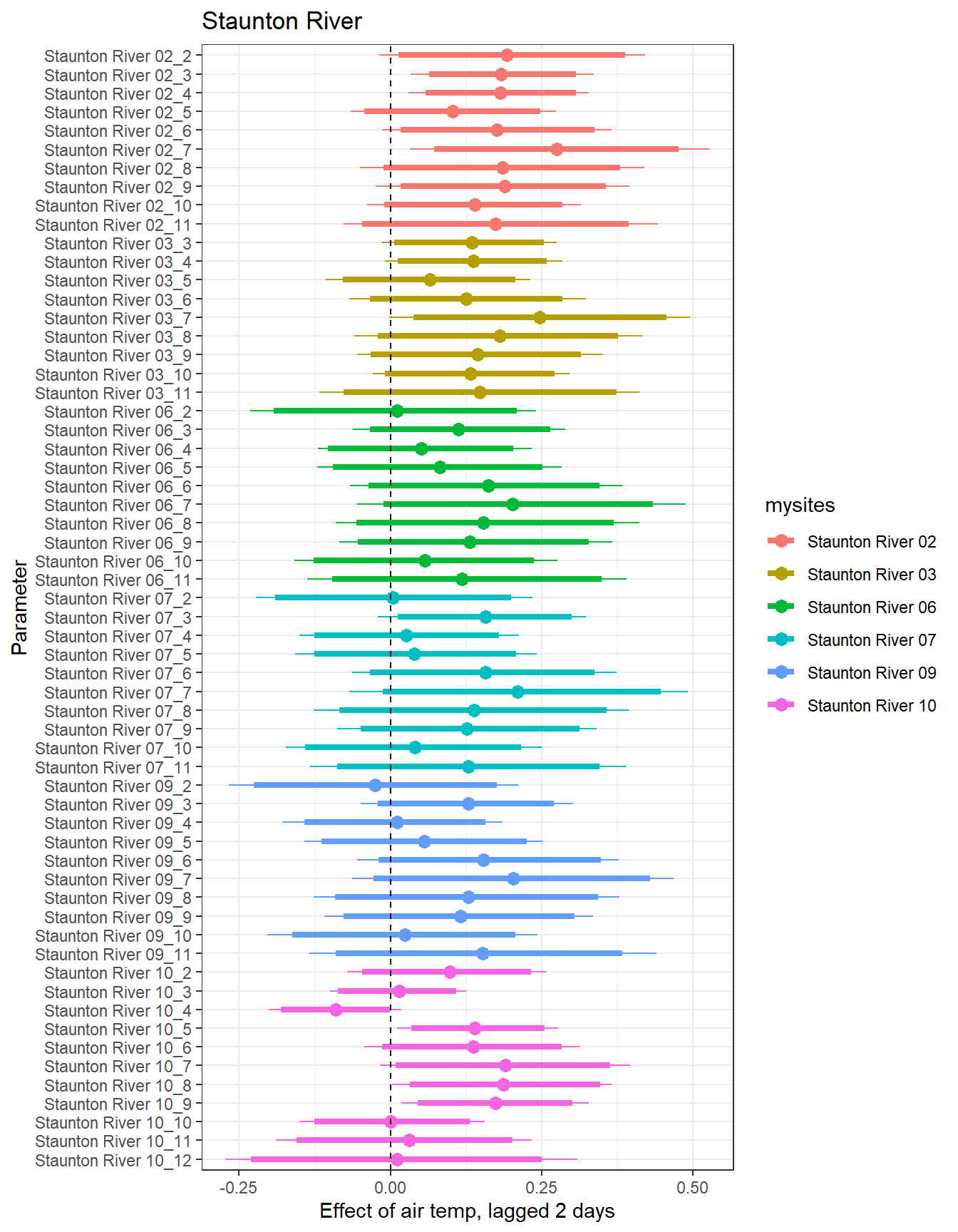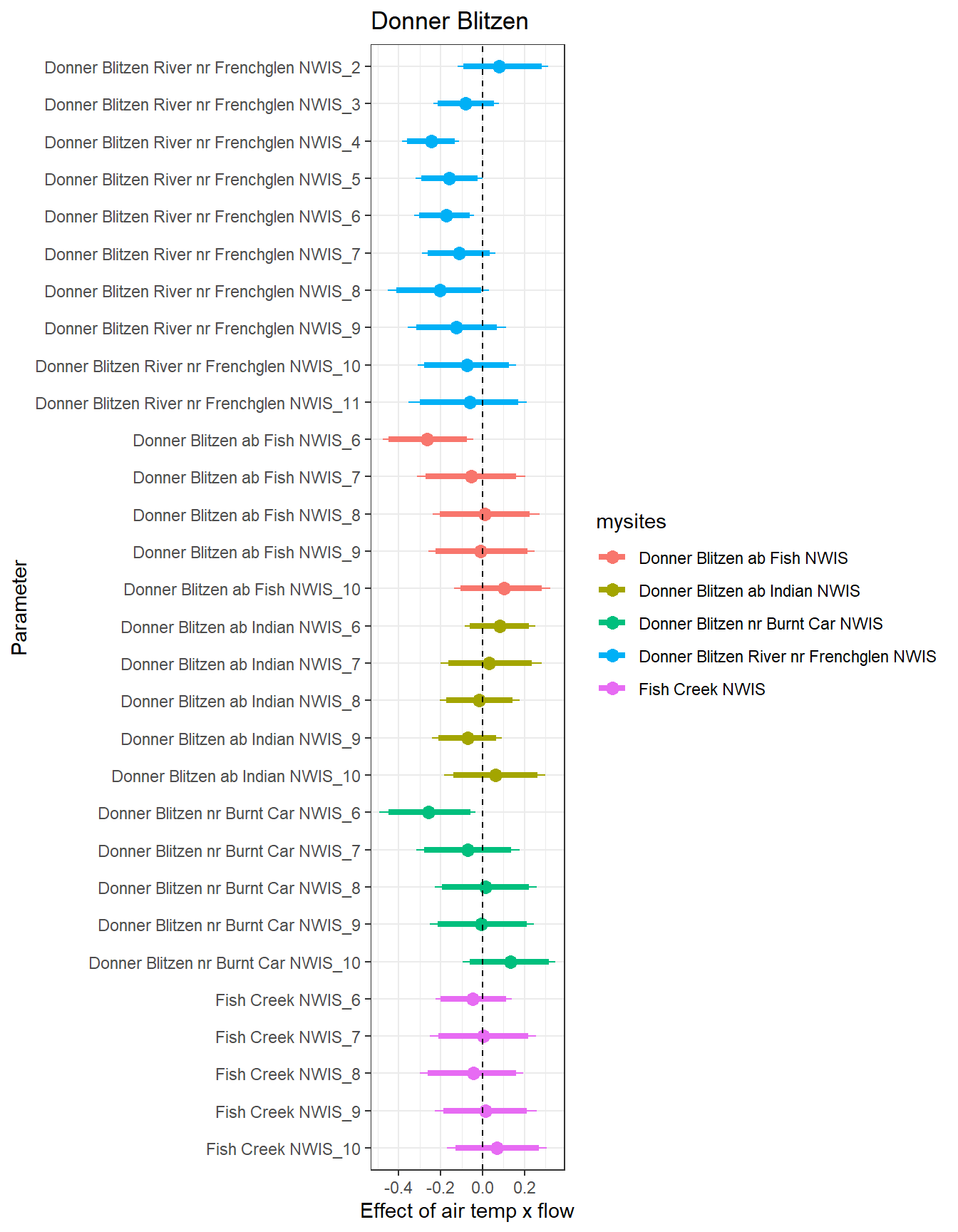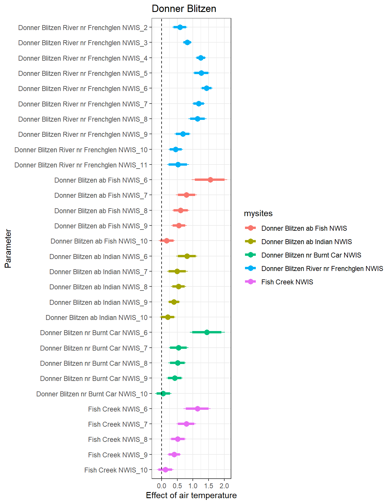# extract relevant parameter namesallpars2 <-row.names(param.summary)temppars <- allpars2[grepl("B5", allpars2)]temppars <- temppars[-length(temppars)]# get numeric components (site code and month)m <-str_match(temppars, "\\[(\\d+),(\\d+)\\]")# create tibble with means and 95% credible intervalsresult <-tibble(site_code =as.integer(m[,2]),month =as.integer(m[,3]),est_mean = param.summary[temppars,1],est_low = param.summary[temppars,3],est_high = param.summary[temppars,7] ) %>%mutate(cont0 =contains_zero(est_low, est_high)) %>%left_join(sitecodes) %>%left_join(sitemonths) %>%filter(!is.na(site_month_code)) %>%mutate(site_name =factor(site_name, levels =unique(dat$site_name)))