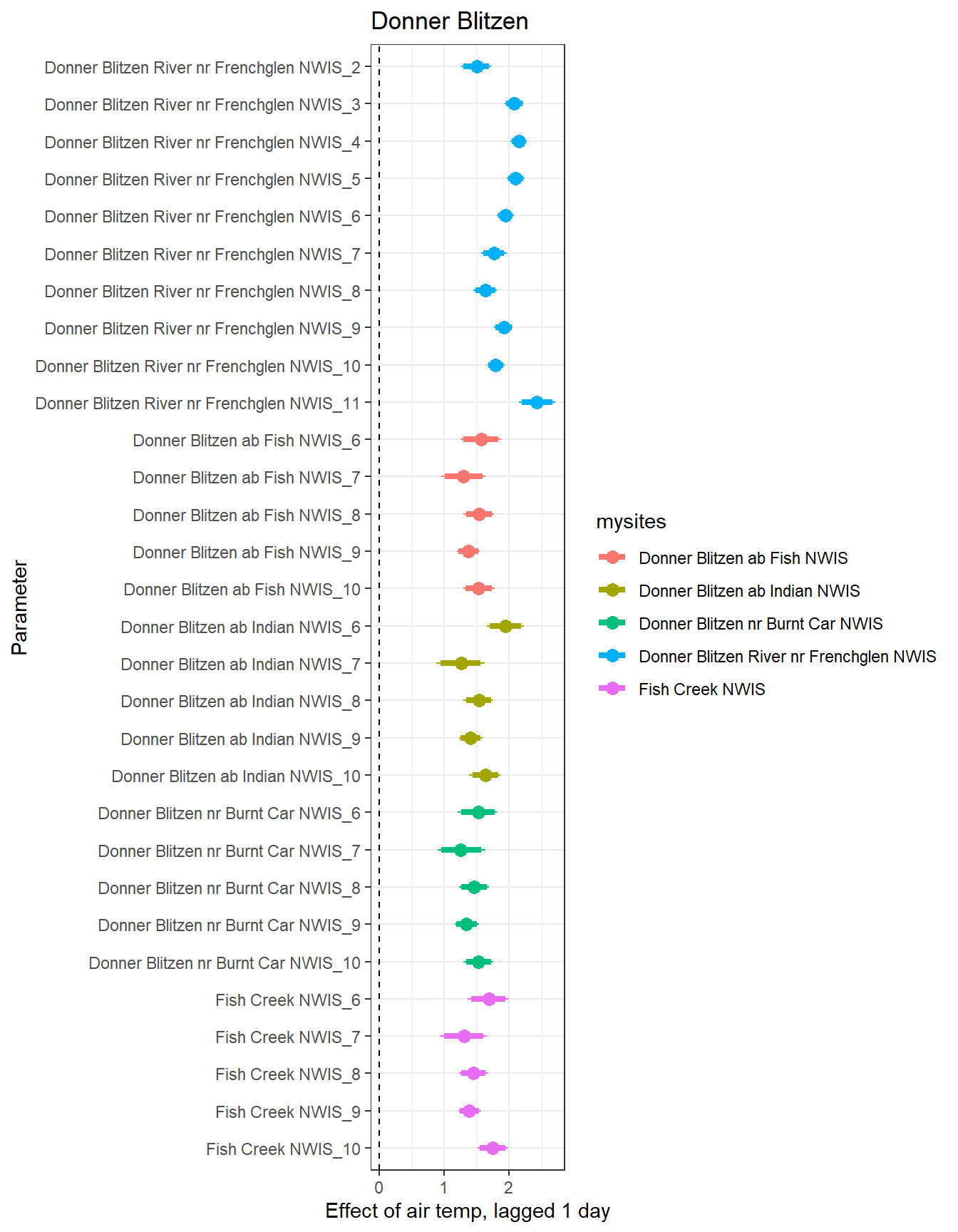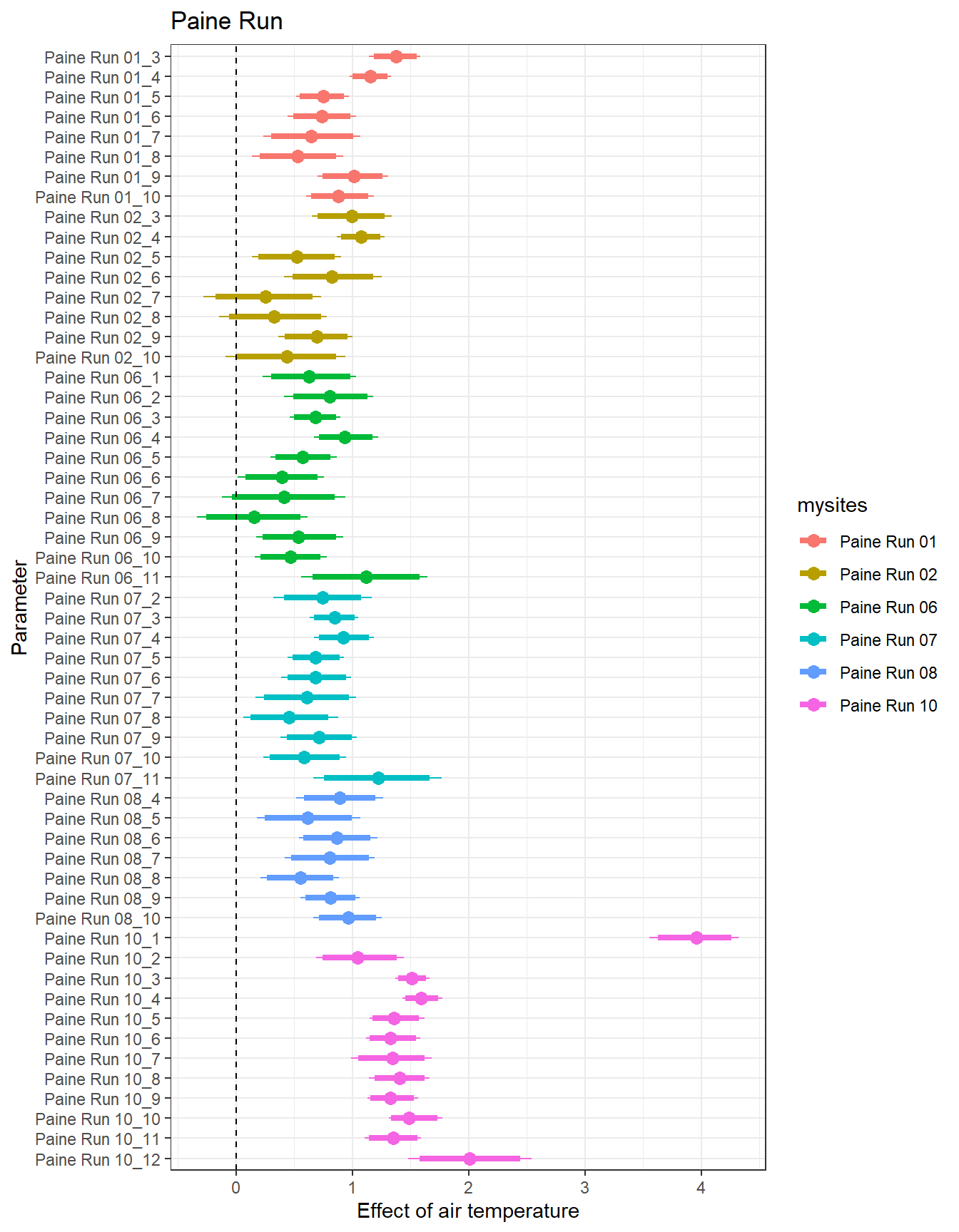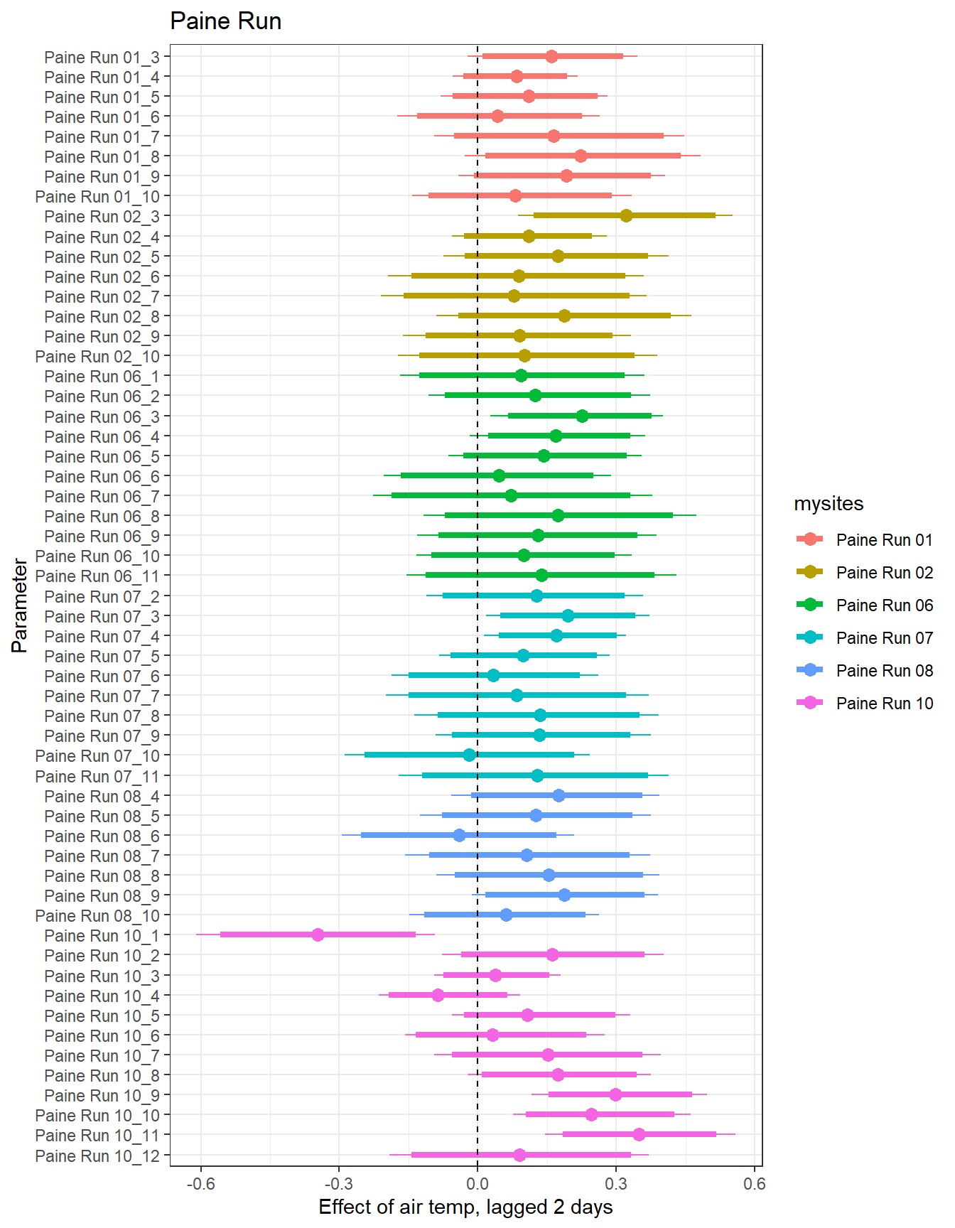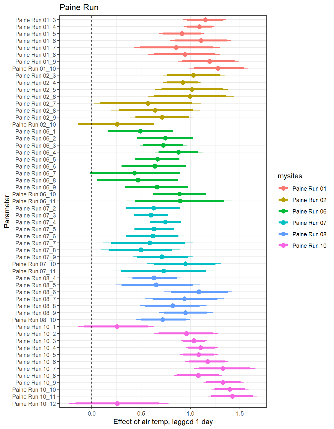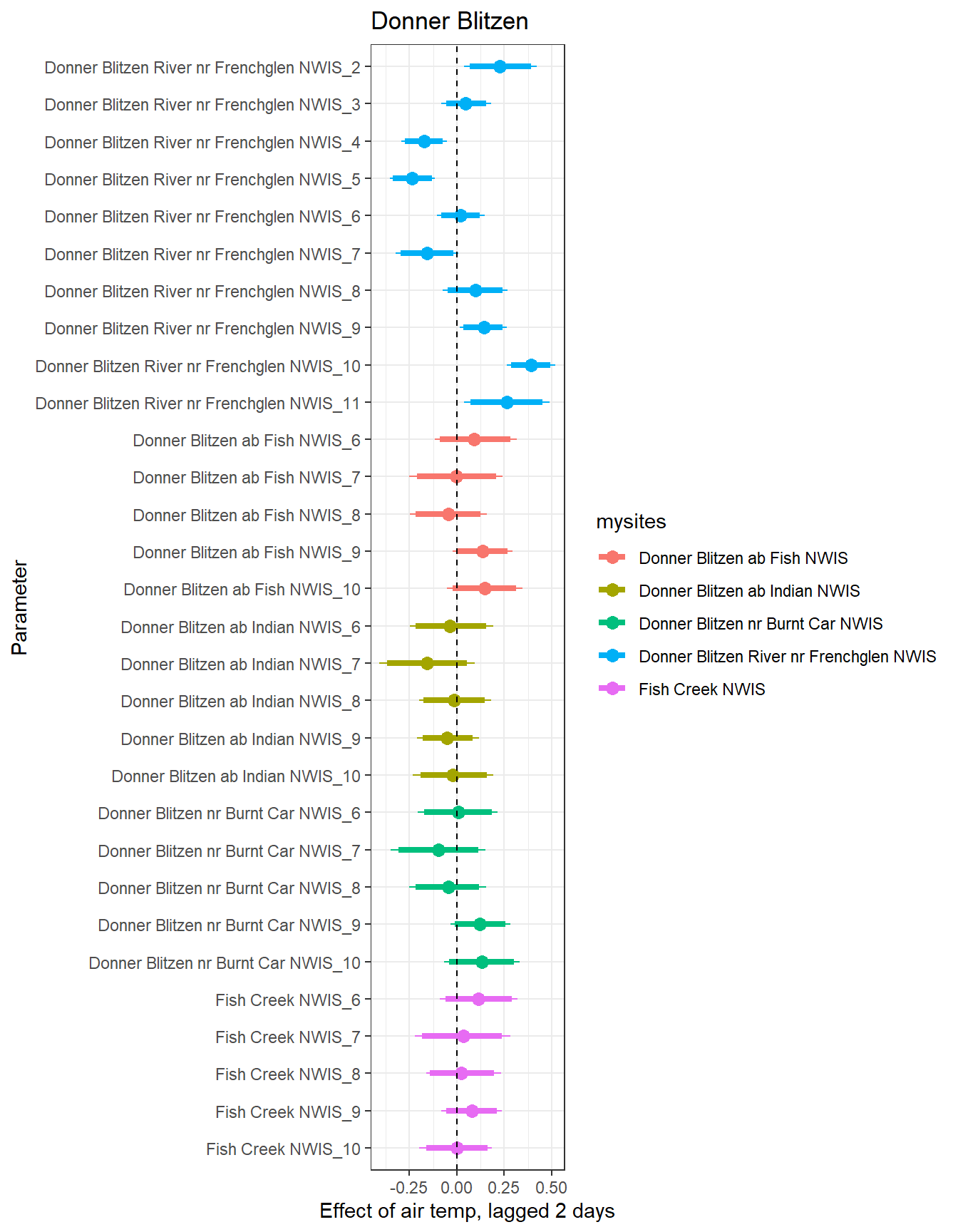 # extract relevant parameter namesallpars2 <-row.names(param.summary)temppars <- allpars2[grepl("B5", allpars2)]temppars <- temppars[-length(temppars)]# get numeric components (site code and month)m <-str_match(temppars, "\\[(\\d+),(\\d+)\\]")# create tibble with means and 95% credible intervalsresult <-tibble(site_code =as.integer(m[,2]),month =as.integer(m[,3]),est_mean = param.summary[temppars,1],est_low = param.summary[temppars,3],est_high = param.summary[temppars,7] ) %>%mutate(cont0 =contains_zero(est_low, est_high)) %>%left_join(sitecodes) %>%left_join(sitemonths) %>%filter(!is.na(site_month_code)) %>%mutate(site_name =factor(site_name, levels =unique(dat$site_name)))