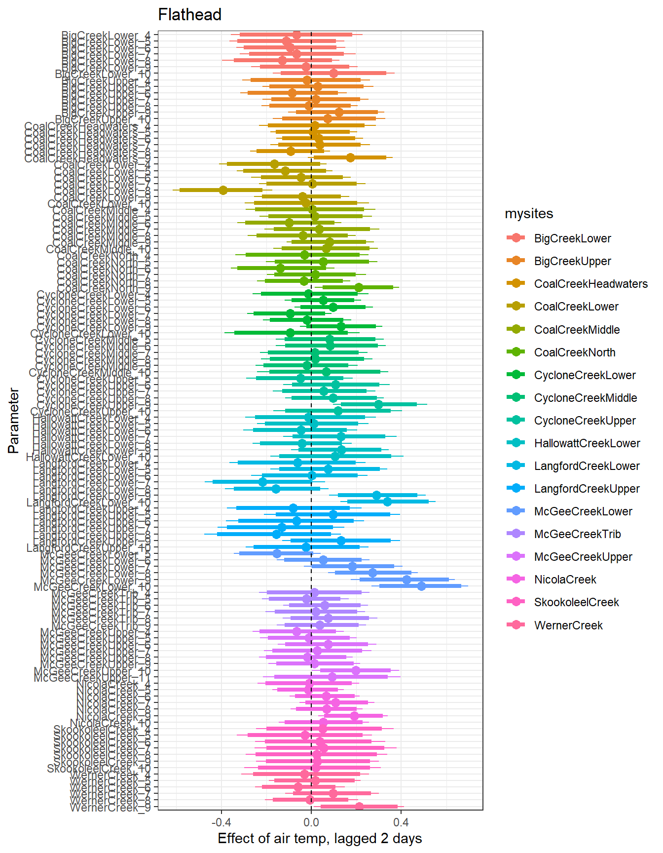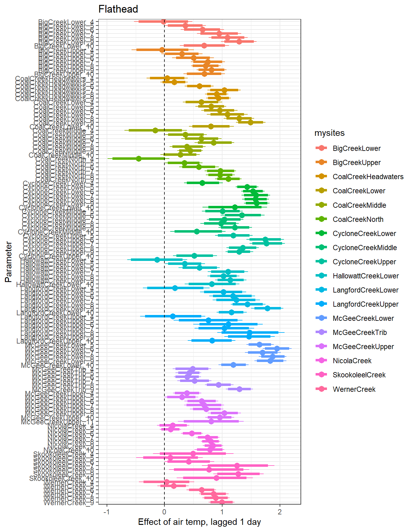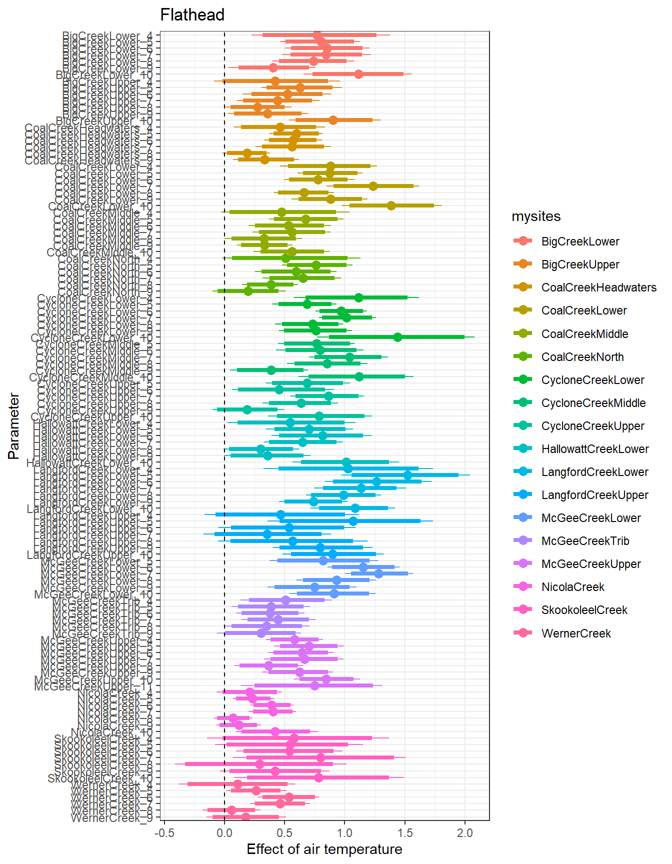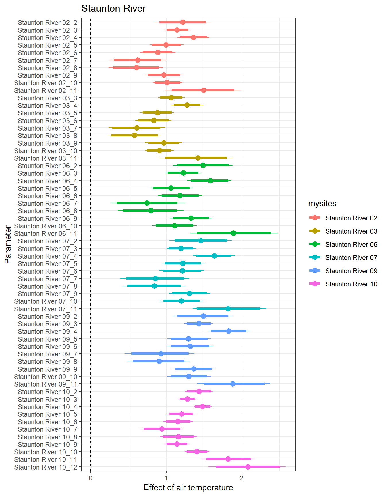 # extract relevant parameter namesallpars2 <-row.names(param.summary)temppars <- allpars2[grepl("B2", allpars2)]temppars <- temppars[-length(temppars)]# get numeric components (site code and month)m <-str_match(temppars, "\\[(\\d+),(\\d+)\\]")# create tibble with means and 95% credible intervalsresult <-tibble(site_code =as.integer(m[,2]),month =as.integer(m[,3]),est_mean = param.summary[temppars,1],est_low = param.summary[temppars,3],est_high = param.summary[temppars,7] ) %>%mutate(cont0 =contains_zero(est_low, est_high)) %>%left_join(sitecodes) %>%left_join(sitemonths) %>%filter(!is.na(site_month_code)) %>%mutate(site_name =factor(site_name, levels =unique(dat$site_name)))