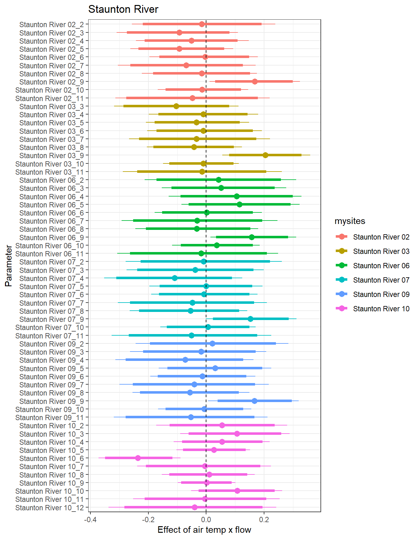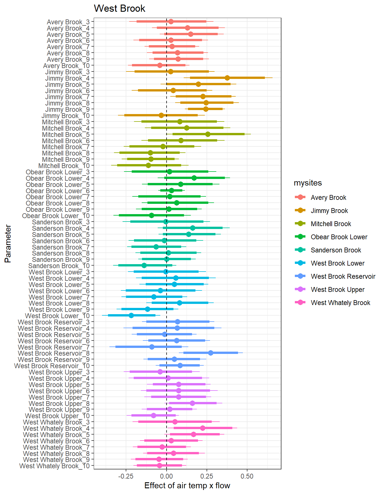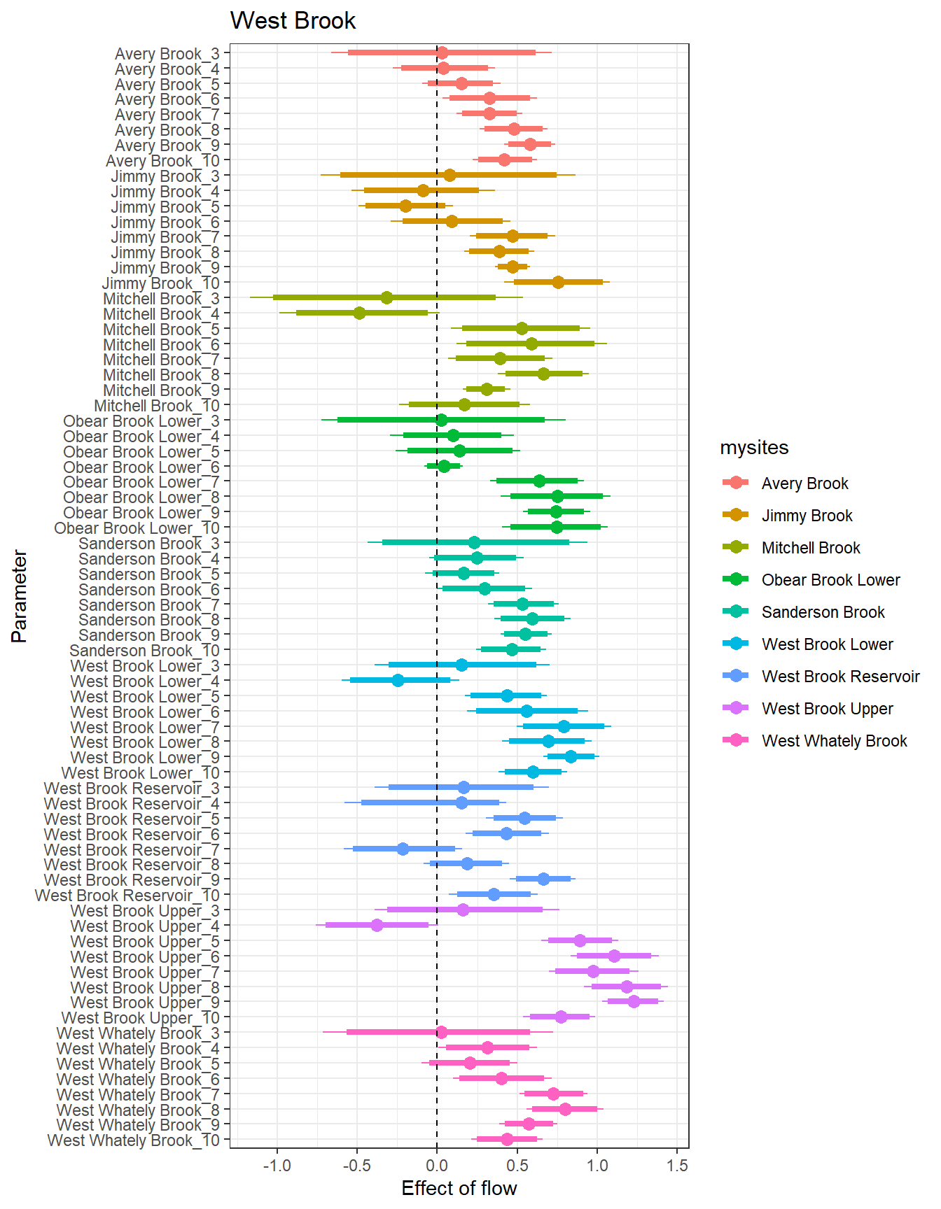 There are some really interesting temporal patterns here, with the effect of flow varying considerably over time within sites. In some basins/sites, the sign of the flow effect changes seasonally, often negative in the spring and positive in the summer. In Staunton and West Brook, flow effects are also always positive: in Staunton, the strongest flow effects are during the spring and autumn, whereas in West Brook, the strongest effects are during summer.