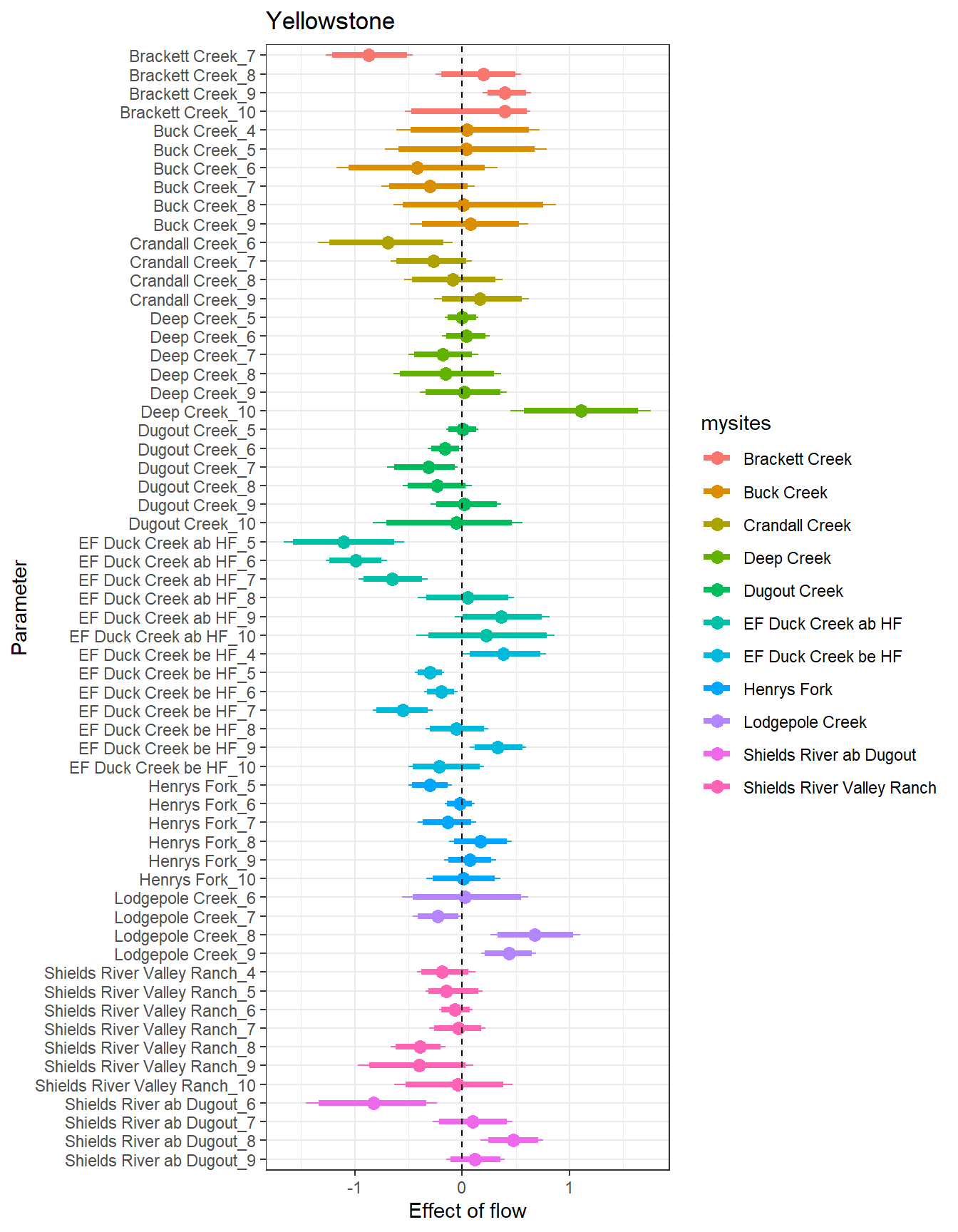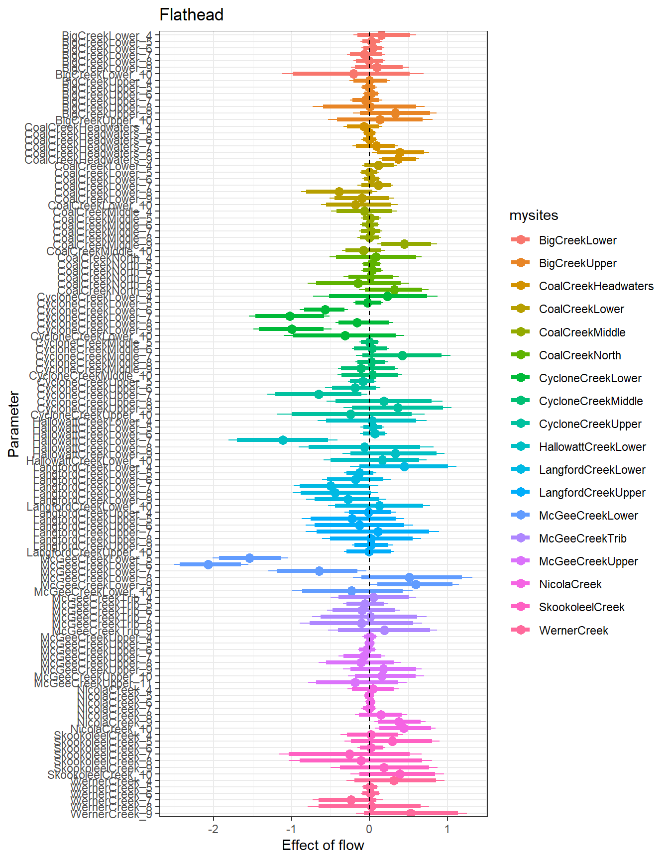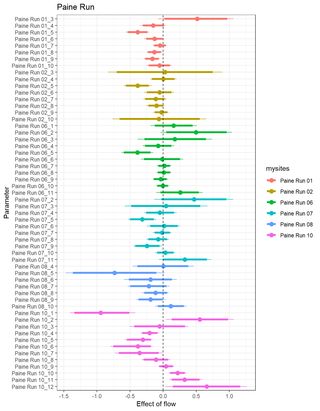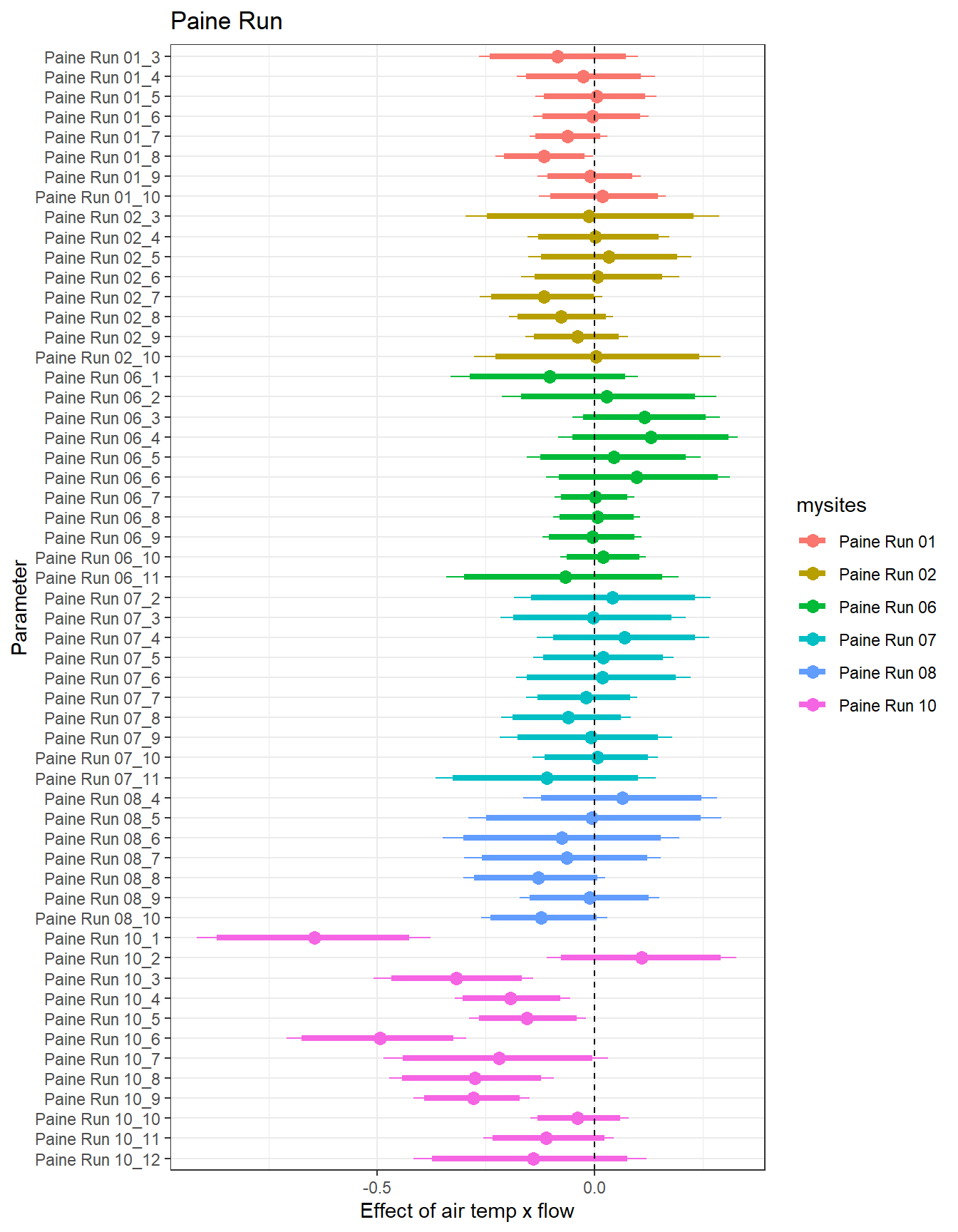 There are some really interesting temporal patterns here, with the effect of flow varying considerably over time within sites. In some basins/sites, the sign of the flow effect changes seasonally, often negative in the spring and positive in the summer. In Staunton and West Brook, flow effects are also always positive: in Staunton, the strongest flow effects are during the spring and autumn, whereas in West Brook, the strongest effects are during summer.